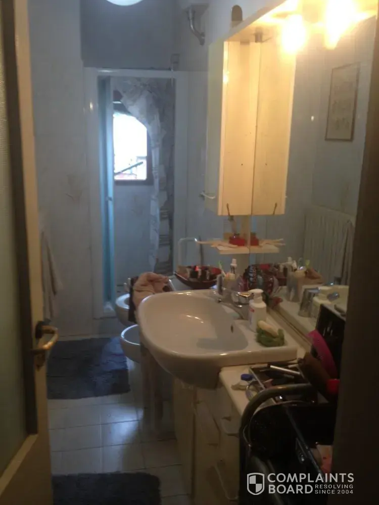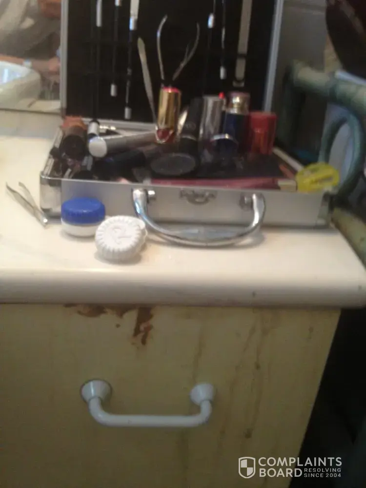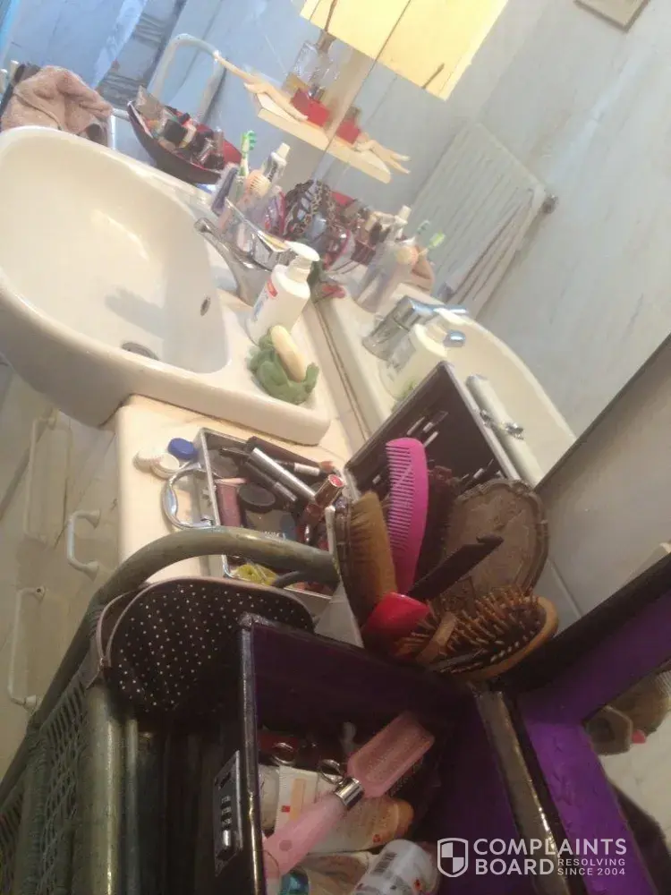 The bathroom is pitted out with the hosts nasty makeup supplies. Stains are dripping along the counters and on the mirrors. Look at the photos!