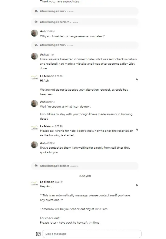 I'm sorry to know that the dates that were booked with your host La Maison Homes, were incorrect that is why you have requested for an alteration. We have tried contacting your Host, but they declined, since the booking was last minute. We can only process an alteration if both party approved, but on this case since your host declined.