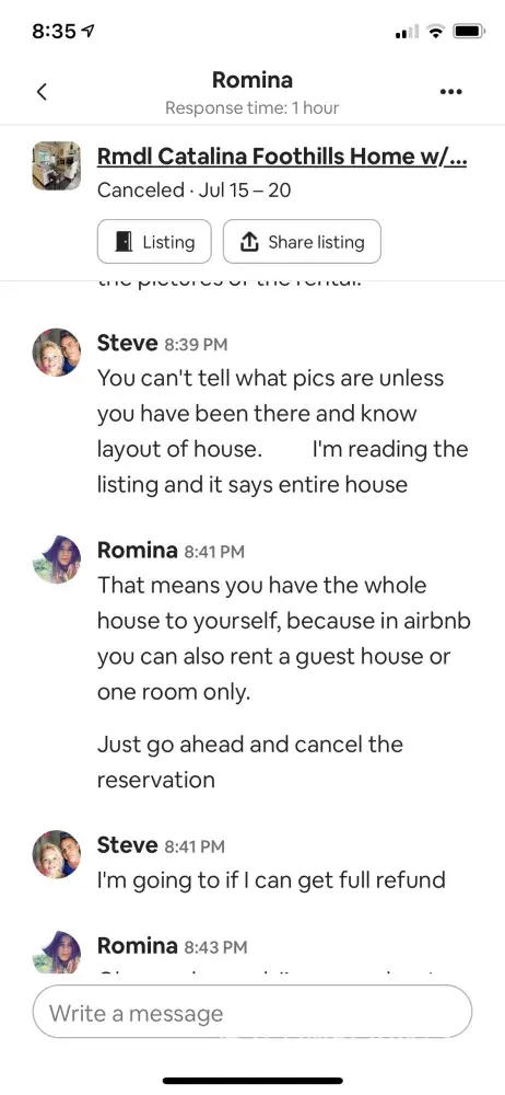 I booked a house because listing showed entire home. 5 minutes later I realized the listing was totally deceiving and last 4 words of desc of house said master bedroom wasn't included. I started conversation with host about it She then went on to tell me to cancel reservation, she told me that about 4 times. But now y'all are only wanting to give me a refund for less than half the booking. It's obvious the listing is deceiving and everyone I showed the listing too also agrees including my attorney. So I want to know how we are going to resolve this issue. I spoke with customer support and have gotten no where even sending them messages where host told me to cancel on numerous times