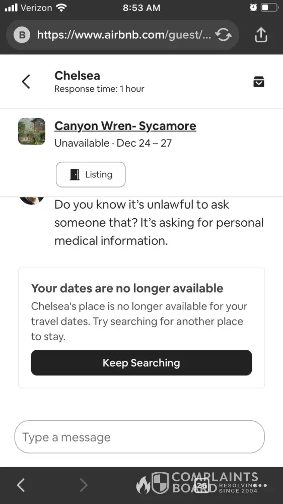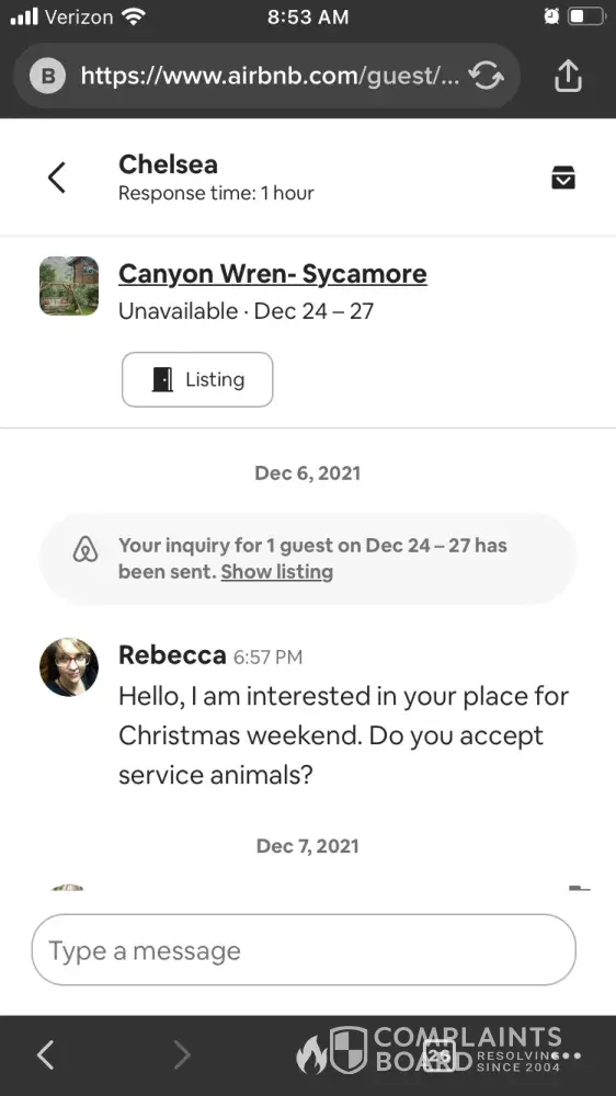 This host then asked me what service my animal provides. I told her that is my private medical information. She did not reply but instead made her place unavailable to me. This is pure discrimination, and isn't right.