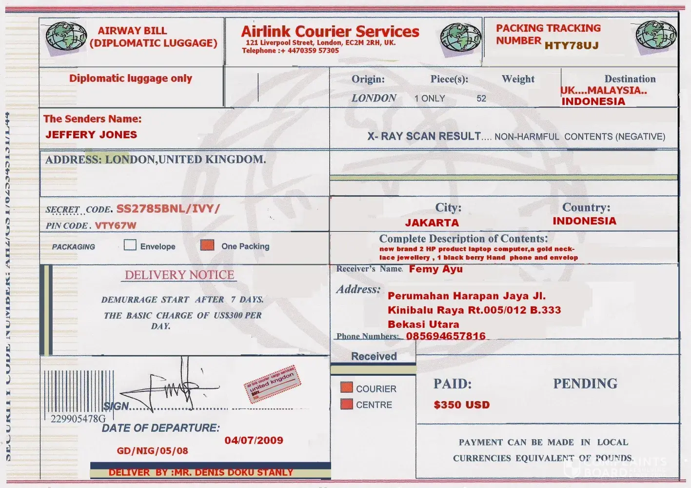 I have airwaybill from airlink courier services from uk, but mr denis doku stanly said I must pay usd 1100. I dont have money so I transfer 3 million idr for that, coz he said its ok. now, my mom is ill and I need my money return 3 million idr. please... I need my 3 million idr now. I stay at jakarta indonesia. [protected]@yahoo.com. please sir return my 3 million idr. thank you
