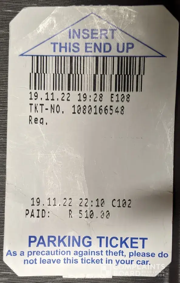 On 2 May 2023 I need to drop off my daughter at the bus terminal at the airport. On arrival I turned into the parking took a ticket and proceed to find the bus terminal to get her onto the bus. On arriving back at the parking I proceed to the pay station to process the payment and retrieve my vehicle. I was shocked to see the machine said my bill was R540. I entered the parking at 08h00 and at that stage it was shortly before 09h00 so it was under an hour. I spoke to a security official who directed me to the parking management office. Here I was met by an extremely rude and unhelpful official who basically told me to open my eyes and read the signs (I have her name). I insisted on seeing a more senior person and after much haggling she called another person who was just as arrogant. She pointed to a sign in the office that said no refunds under any circumstances. Another person arrived whilst this was happening and he too had experienced the same thing as myself. Despite this the official said the signage is clear and we must pay the money. I then decided to leave and pay as I was afraid I might say something I would live to regret. I then exited the parking after paying the R540 at 09h41. Ticket number: [protected].
