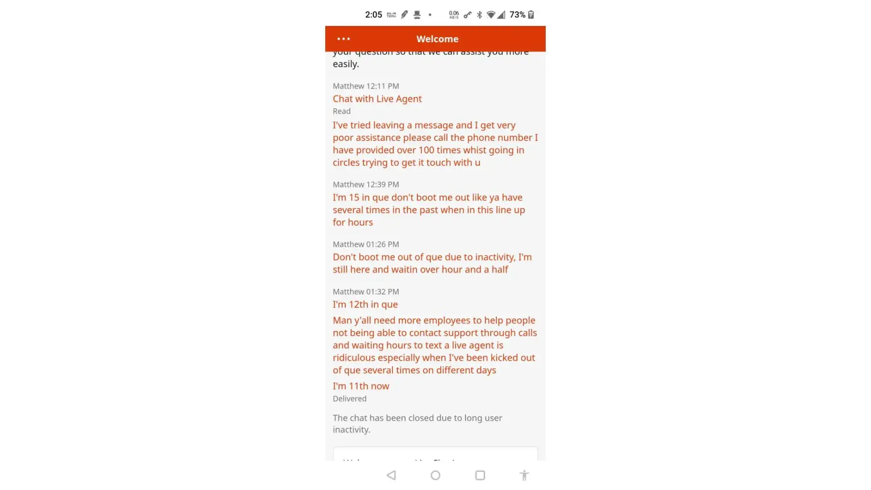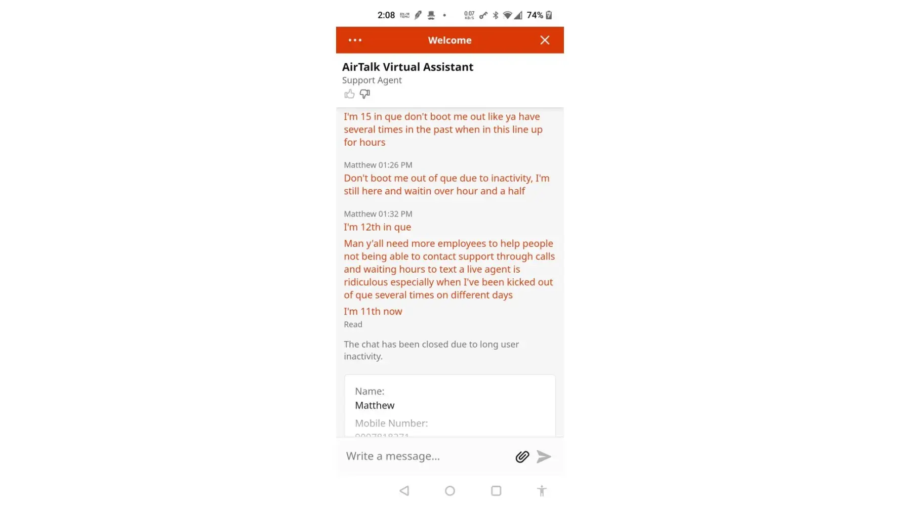 WAT168329689 this is [censored] this is the seventh time this has happened to me that my chat was closed after waiting hours to speak to someone only to get my check closed for inactivity even though I was constantly texting to verify that I'm still here I'm still here don't boot me out and I get booted out what the hell is going on with your company this is ridiculous you have wasted so much of my time I need to speak to a live person now