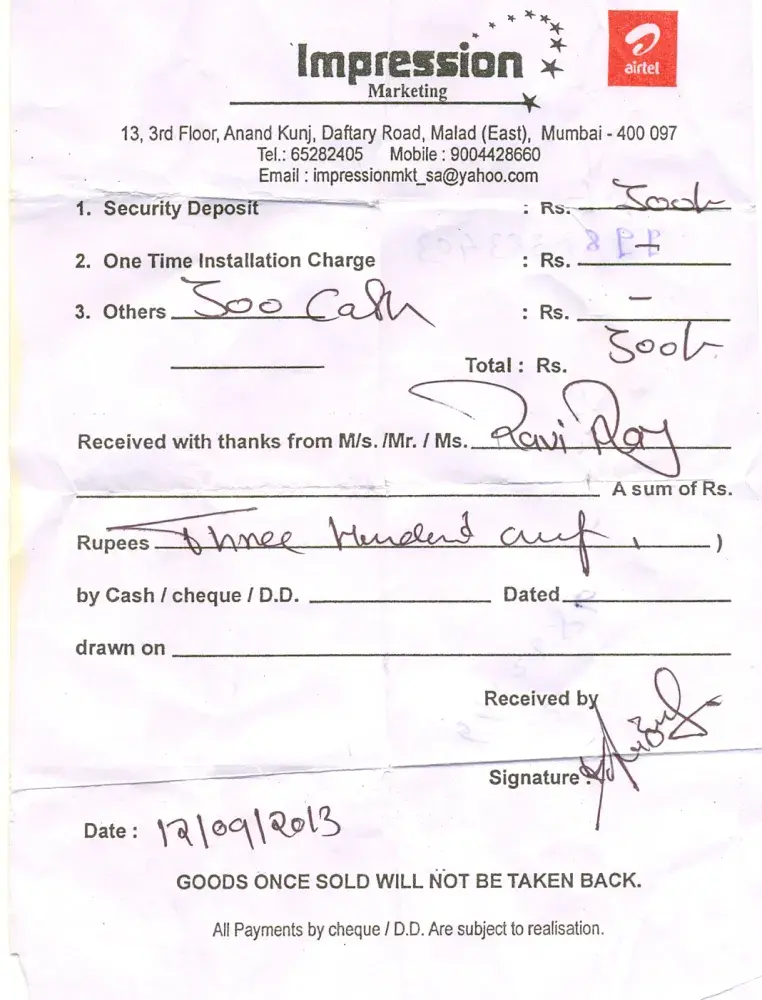Representative from impression marketing came at my residence for taking deposit and collection of document On 12 September 2013 but did not gave receipt by them, so i had to visit impression marketing office to collect the receipt.