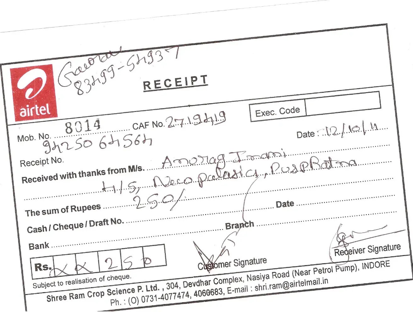 another my new internet connection with tel. phone conection having account no. [protected], in this bill of airtel have Added 250 Rs. instalatin charges which i have paid in advance to airtell by receipt no. 8014, some gaurav of airtel having cell no. [protected] have given me this receipt.