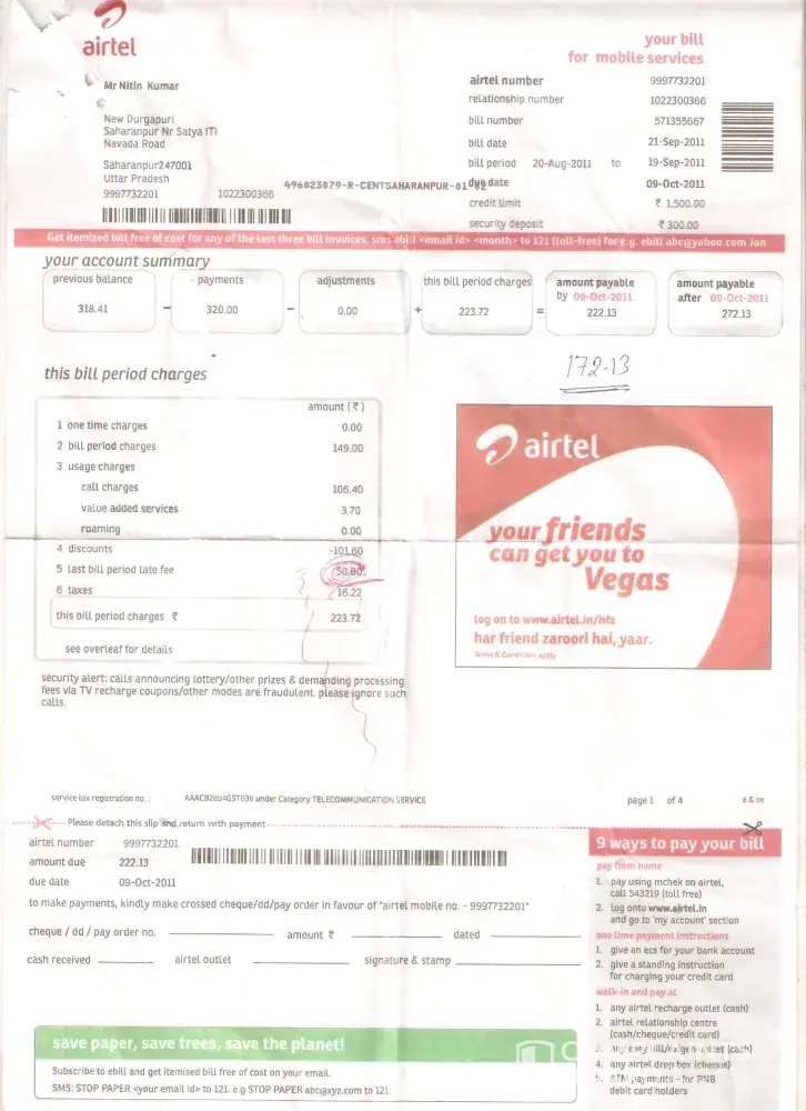 Airtel Bill for period: 20/07/11 - 19/08/11; Due Date: 08/09/11; Amount: 487.98/-