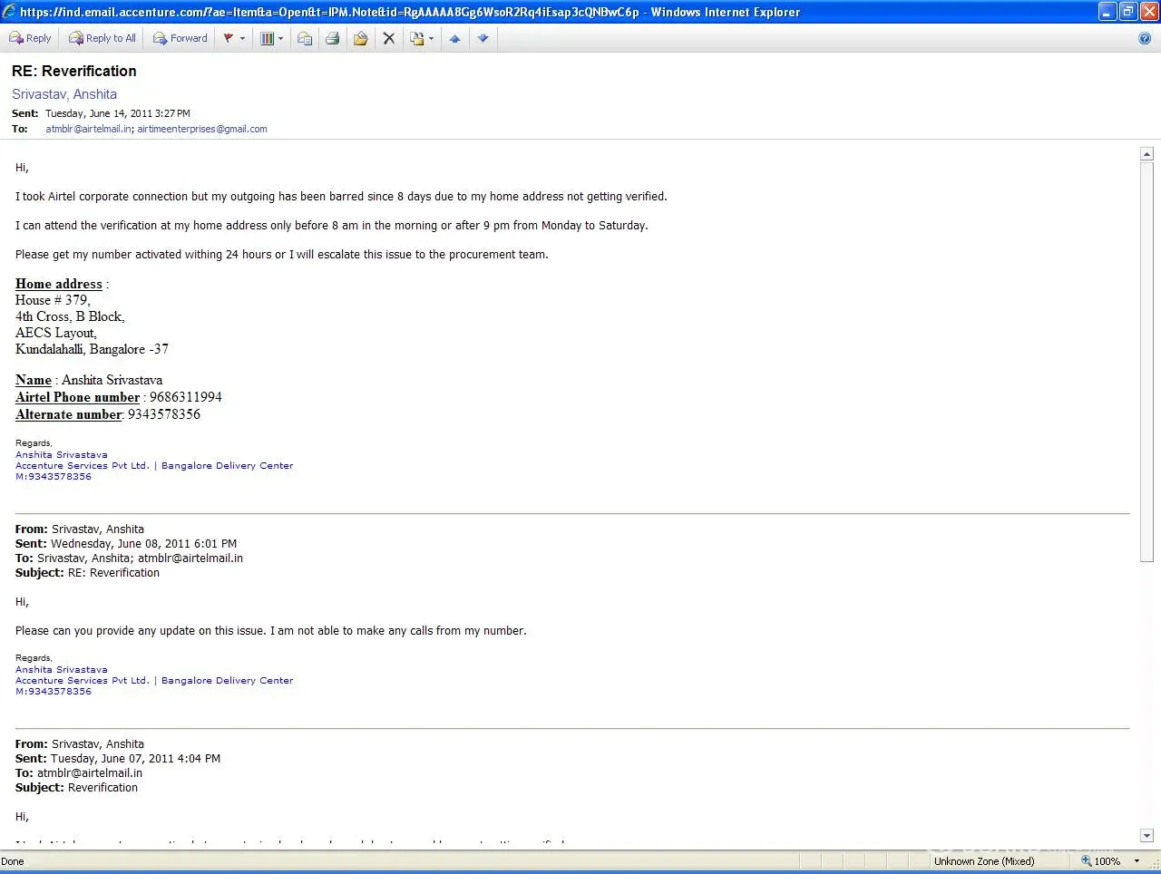 I took Airtel corporate connection but my outgoing has been barred since 8 days due to my home address not getting verified. i lodged this complaint with the executive and it has been more than 10 days that nobody came for verification. the executive from whom I took the connection is Sheshadri (mob: [protected]). I was asked that I should drop a mail and my reverification will be done. I was told daily that the executive for reverification will come tomorrow. i mentioned the time when I can be available at home but nobody ever came. Nothing happened for 10 days, nobody came for the reverification and now my incoming is also barred. I have tried talikng to this man but he doen't take my call now and my number is inactivated. i have atteched the mails that I repeatedly sent and recieved no response.