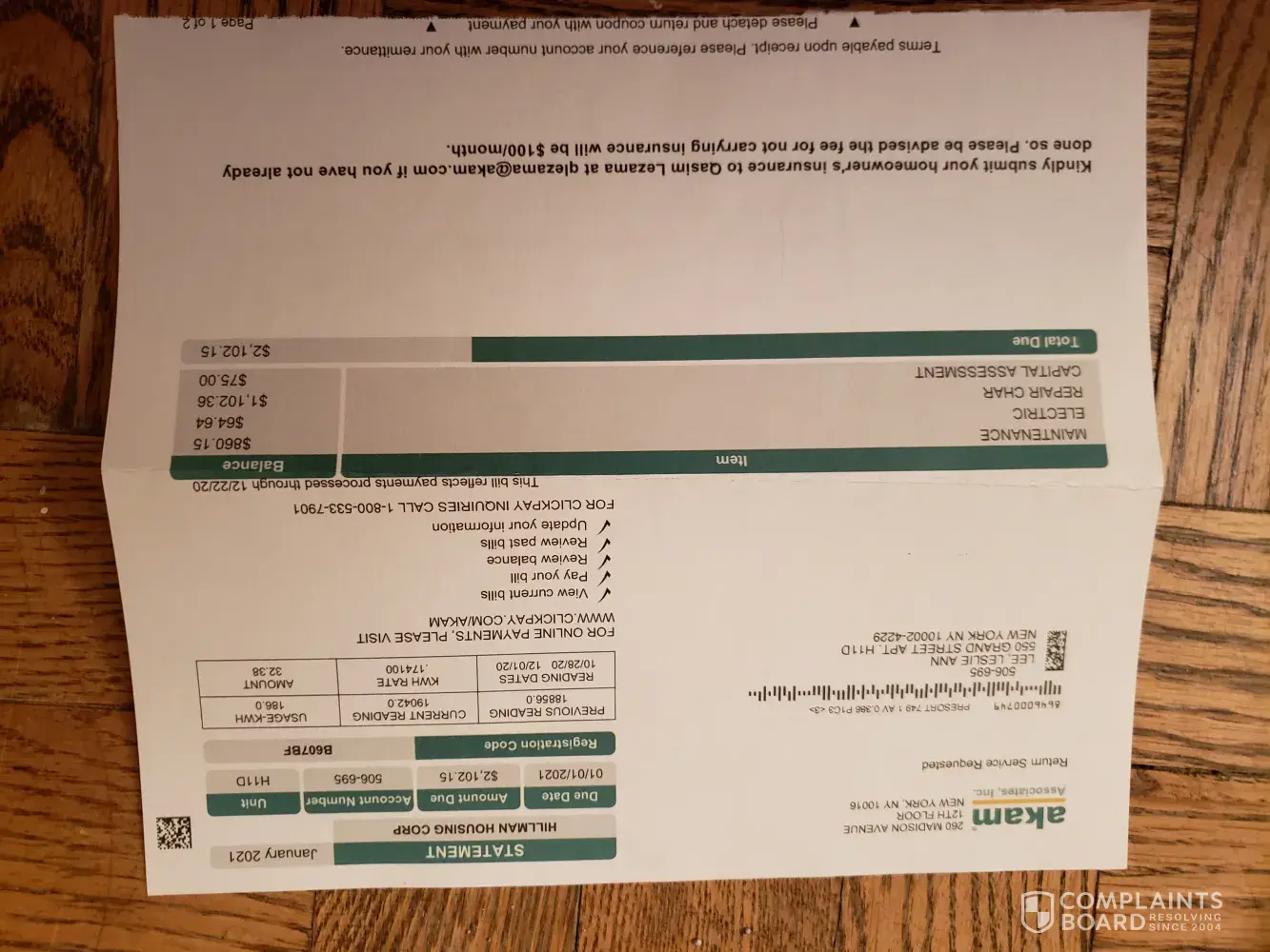 In January 2021 attached to maintenance bill was this ‘Repair Char' of $1, 102.36. Akam Associates nor the Hillman Housing Board give any official notice of charges for maintenance in the building. There are no posted maintenance charges. Nor was I informed verbally or in writing of these pending charges for maintenance. Nor was I allowed to give consent knowing that there would be charges. East River Maintenance had never charged for maintenance in the forty years that I have lived under their management and they actually fixed and did repairs in apartments. Akam Associates refused to do any repairs and always referred me to an outside contractors. If Akam Associates were outside contractors, I would refuse to pay, they did nothing to earn the money. Five minute surveys of the damage are not repairs. What am I paying for - I had to get my own contractors in for a total of $650.00