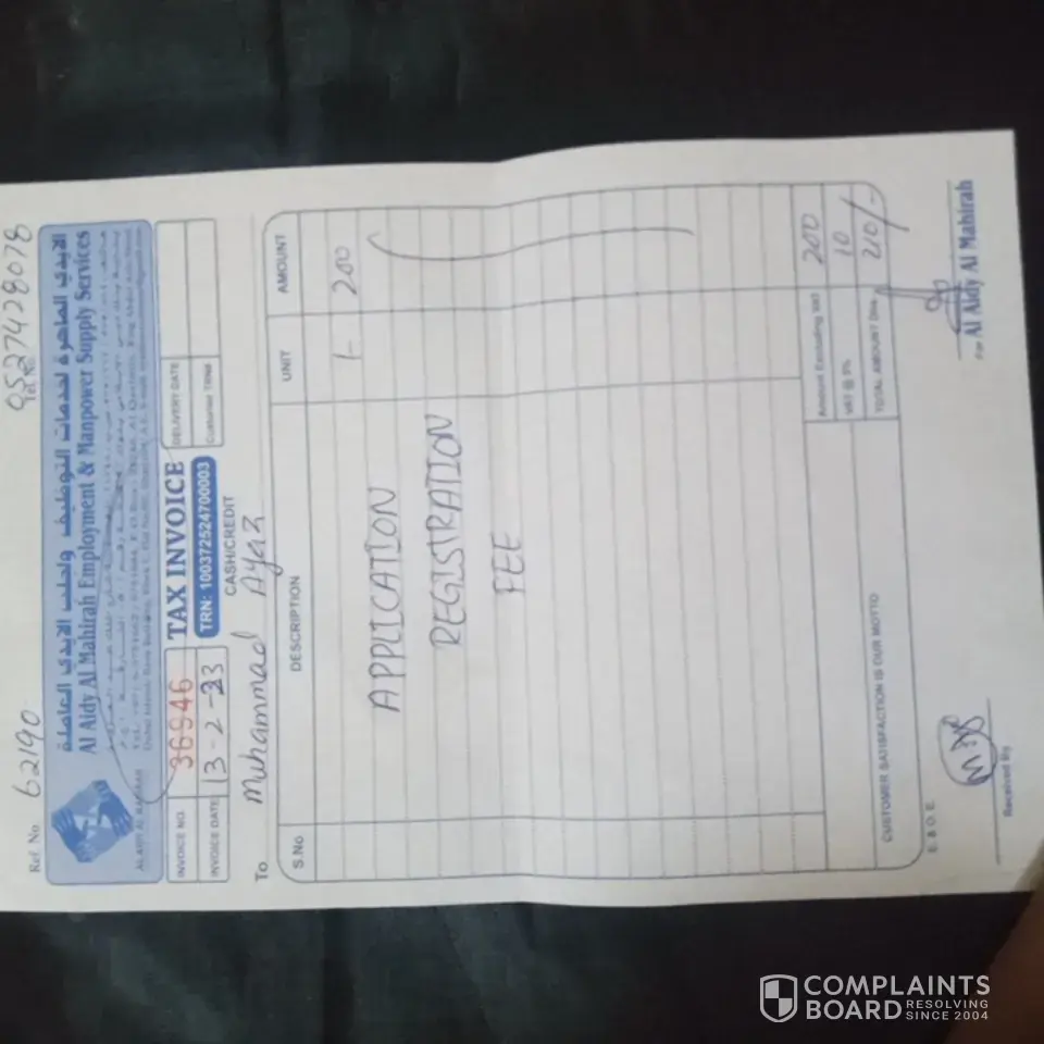 On 02/06/11 I went their seen the named was “AL AIDY AL MAHIRAH EMPLOYMENT & MANAGEMENT CONSULT SERVICE S†there Ms.Samira has taken a small interview kind, , she told me to registered with them by paying Dhs.100, job is for Customer Care Executive, She assured me that she will fix interview within few days, 8th june I got call from the same office landline number to meet at there office before 3’ o clock, so again I visit their on 9th june. I met with Mr.Rehan, again he asked few interview kind of question like I want to be on husband visa or employment and he said in next few days he will fix a meeting with the Company Oriential group of company but for this I need to pay 300 Dhs. Assured job with salary 3500 on husband visa.