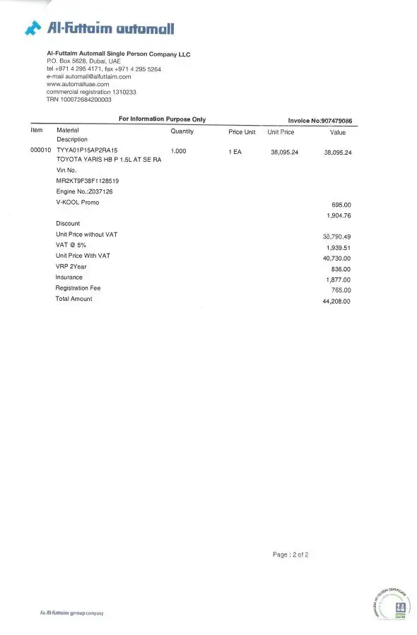 I would like to raise an issue and encountered situation regarding the pre-owned vehicle that I bought from Al Futtaim Automall in January 2019. Toyota Yaris 2015 model. Indeed, it was clearly mentioned that this vehicle had 0 accident. However, I have decided to sell the vehicle after 3 years and after completing the inspection to estimate the car value for resell, the price given was very low compared to the amount I paid to buy the vehicle, almost 45,000 AED car value, I did a loan for 5 years to buy this vehicle. The report came to me and I was completely surprised when I discovered that this vehicle had 5 accidents in 2015, 2016, 2017 and the full body of the car is repaired and repainted. It's very disappointing as I did a personal loan and this information was never given to me or else will not buy this vehicle in 2019. The car value is very low compared to the price I paid. Please refer attached to all documents and online accident report for your consideration.