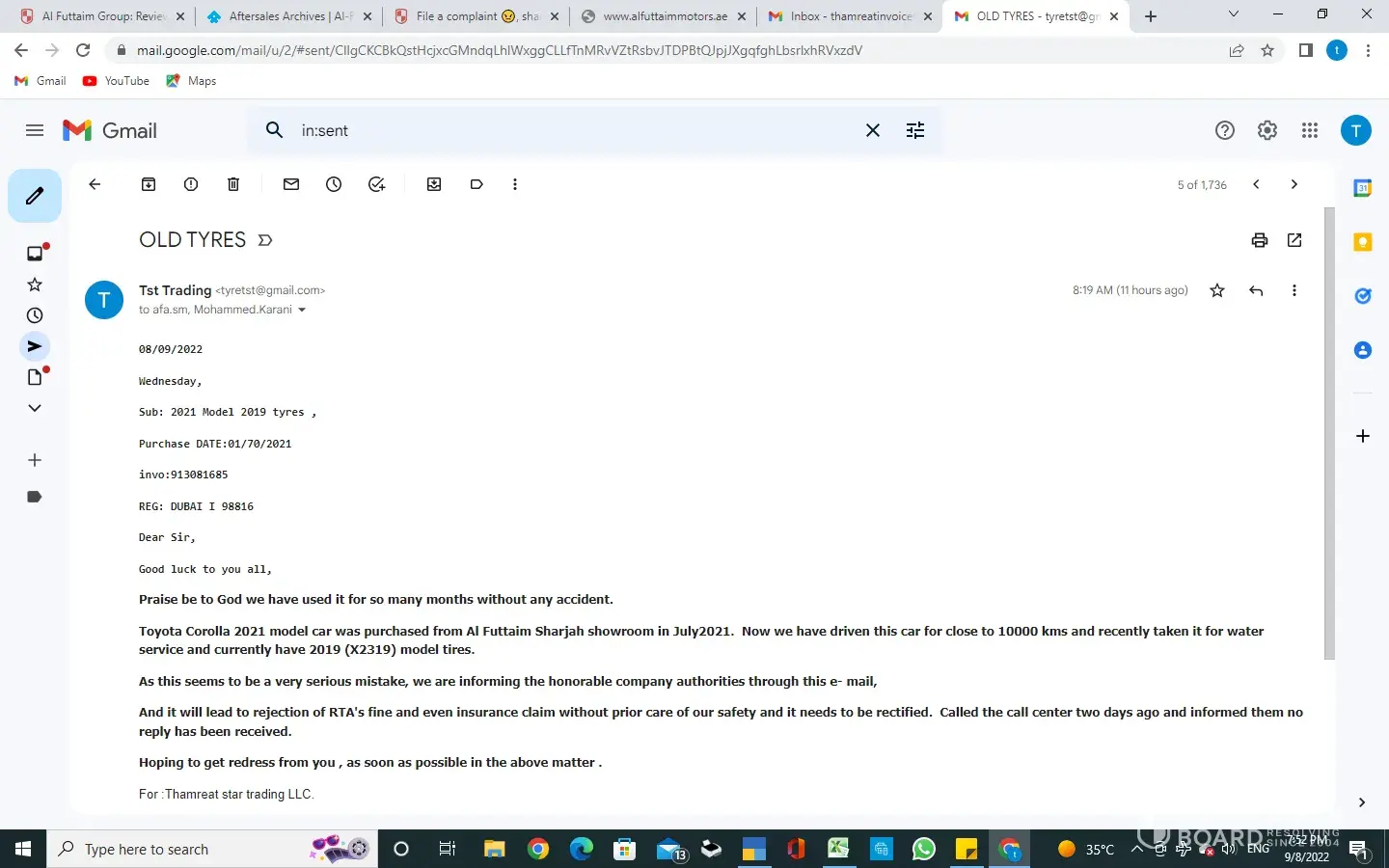 I went to buy a Toyota Corolla cross from Toyota Mussafah showroom August 2021 and requested to have car tint with heat isolation 70-100 percent and nanoceram protection,I didn't notice that the heat protection was not like I recommend, I talked to the salemasman sameh,he said it will get more dark in colour,I complain since June 3,2022 till today ,only recievng emails,we will respond,I call the call center and at the end no action,more than two month,their supervisor said because you are Egyptian ,they thought you will not pay,although I payed cash for the car and took extra Toyota insurance for the car paying more money.dont trust the salesman Sameh.