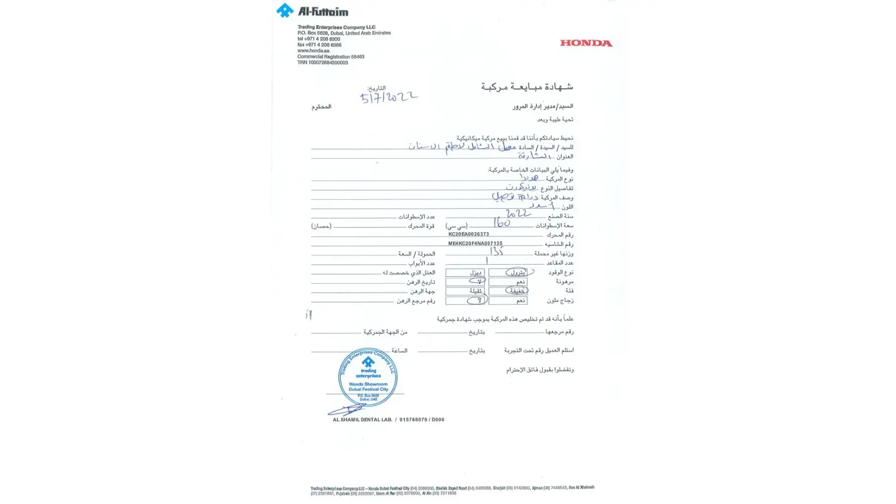 On 1st July 2022, I send whatsapp msg to Mr. Anas at 4:12 to remind him, after an hour he send a voice msg that the link is sent to me to pay AED2000 for booking that immediately I paid and informed to Mr. Anas, after which he send me msg that right now, we are selling 2023 model, no more 2022 and he send me specification 2023 as attached showing new price 106900 and asked me to consider AED 3000 more for shipping and color and received a purchase agreement (attached) which is showing 110900.