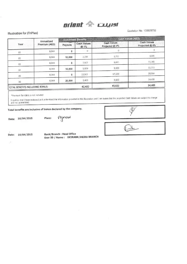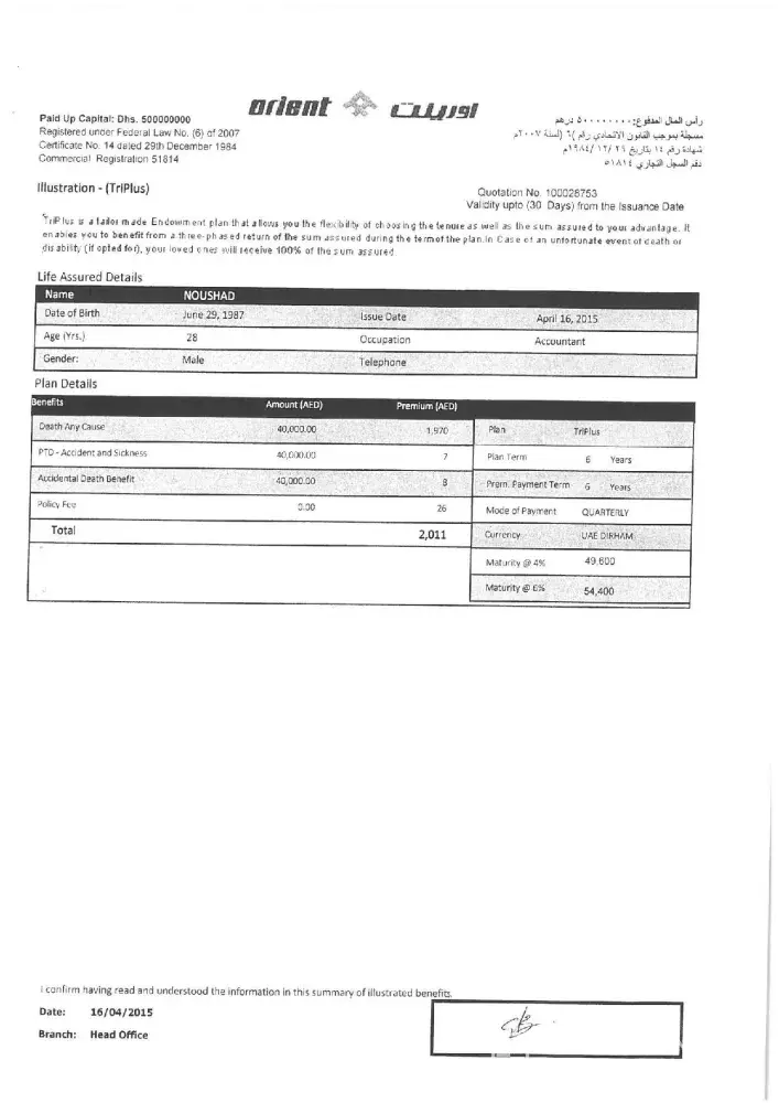 The illustration paper I signed How can you prove That customers have to pay 48264 AED /- Mathematically ? (Your Agent trick me here that she say no need pay last year then it will come 40000/- AED + 1 % guarantee )