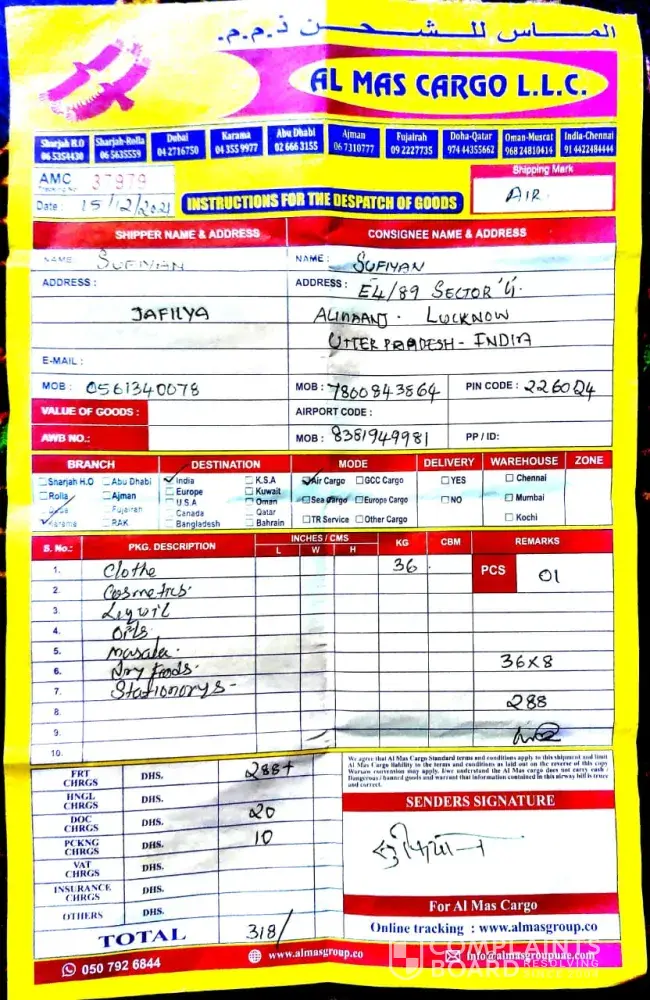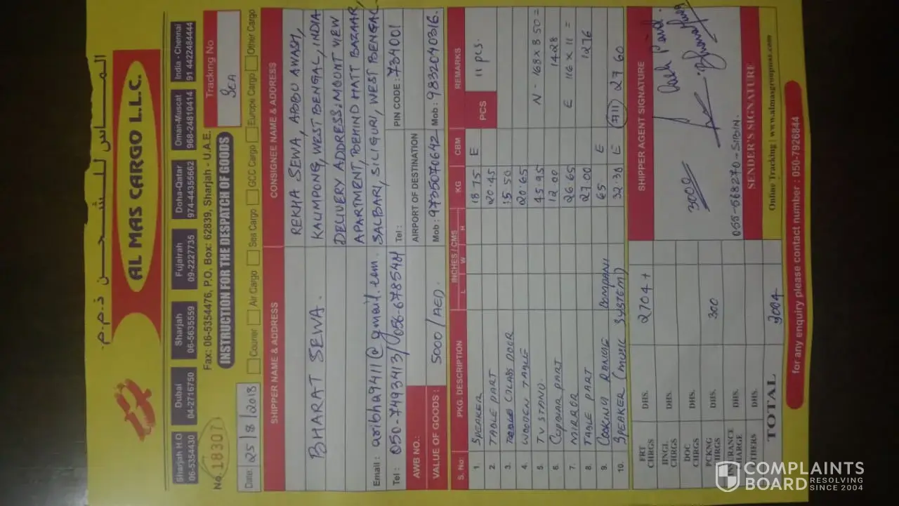 Thank you for your feedback however, we are unable to verify any of the information you have described nor can we locate your name in our client database. We take customer feedback very seriously so if you contact our manager directly at [protected]@almasgroupuae.com so we can resolve this issue as a matter of urgency. Many thanks. Support Team - AL MAS CARGO.