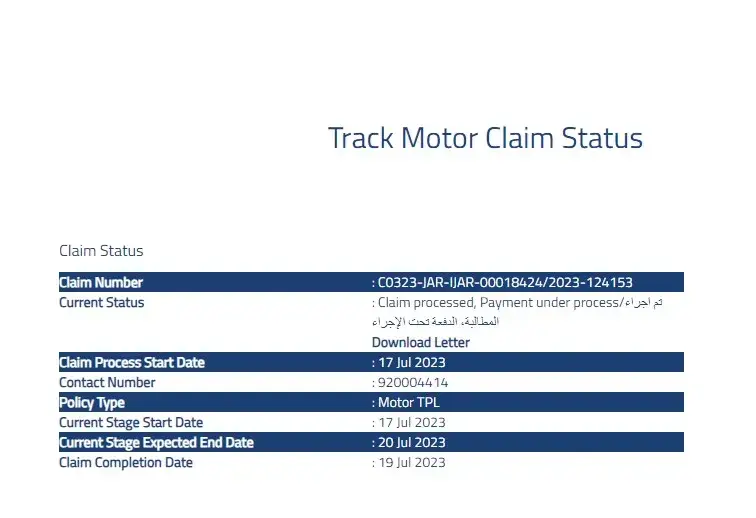 Unfortunately i try many times contact customer care service but the number was wrong and try to check Track Motor Claim Status is show always under process. kindly pay pay Motor Claim on time if not I will complaint police and Saudi governments