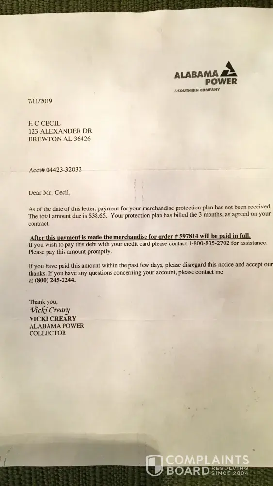After several calls Alabama Power Customer Service and Warranty Services, I learned that my Warranty had been cancelled for "Non-payment" and could not be reinstated or re-written.