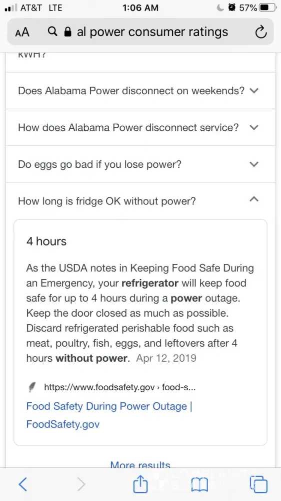 Worst power company ever! Do NOT move to AL, the reason you ask? AL power! It takes them 20+ hours to resolve a minor power issue. They are in no rush to turn your power back on! We've had food ruin in the fridge because the power was out for so long. This is not an every once in awhile problem, it's frequently! Even when there are no storms! Pathetic company, selfish for not thinking of their customers. When the power is out past 4hours AL power should pay our groceries that are ruined!