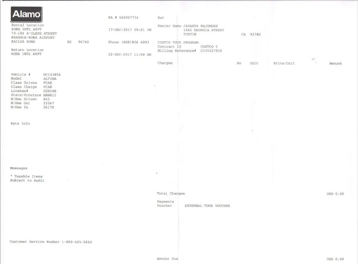 I had rented Alamo Car as part of a Costco travel package, and after returning the car, received a zero balance receipt from the rental office.
