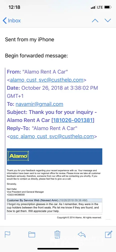Extremely disappointed by how my case is handeled. I forgot my glasses in the car upon return. Car was rented and returned back at Paris airport. I have been contacting daily and have spoken to 3 respresentatives in 2 days. They keep reassuring that someone will contact you soon, that hasn't happened yet. I don't have enough time left for my stay in Europe. My car rental details are as follows: