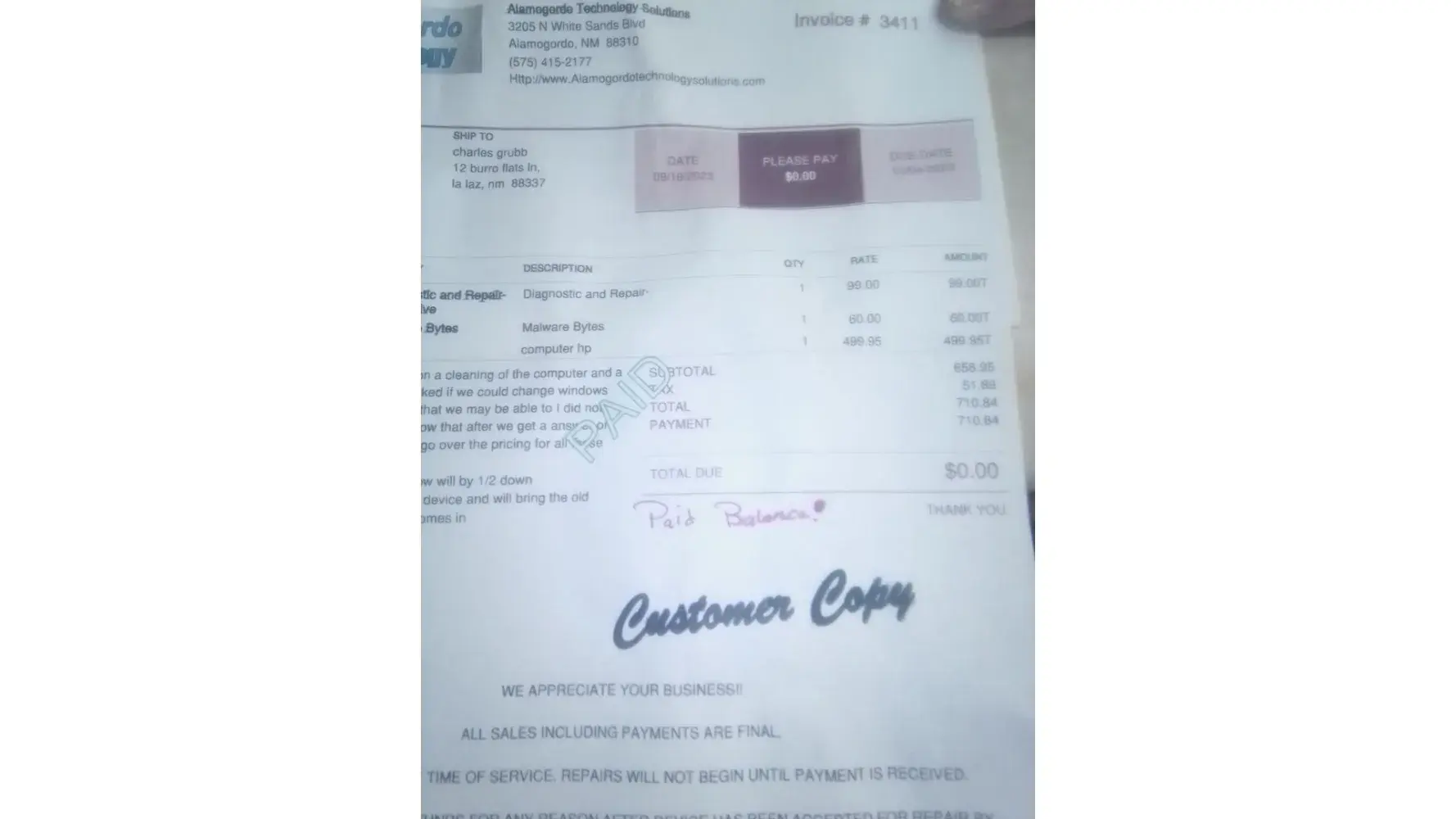 The owner of Alamogordo Technology Solutions, LLC is unprofessional and talks a lot. He doesn't keep his word and takes your money without providing any service. Once they have your money, they don't bother to communicate with you. It's up to the consumer to reach out, and even then, they make more promises but still don't update you on the status of your repair. When you lose respect for the business and the owner and ask for a refund, he simply tells you that you won't get one and refers you to their policy. However, nowhere on the sales slip does it mention that there are no refunds. You have to pay upfront, and then they take their sweet time in communicating with you, despite promising to call you within a day or two. When a week passes with no call, you have to be the one to call, and that's when the runaround begins. I'm on a fixed income and have a small business, and I really need my phone. It's cracked and keeps cutting my hands with sharp pieces of glass. Plus, the bottom button doesn't work anymore. I had to insist that they write down the details of the repair on my sales slip, but they kept saying it was just for their records. I refused to sign the slip until they typed in what repairs were being done. I reached out to the Chamber of Commerce in the area, and they informed me that they have received several complaints about this company. I don't trust them to work on my phone, and I don't want them to touch it. I just want my money back. I paid for a service, and I still have to use my dangerous phone. I had to call them twice before deciding that I wanted nothing more to do with them. After my final call, where I requested my money back and threatened legal action, the owner sent me a text saying that there would be no further communication. Ten minutes later, his sales lady called, claiming she received a message and asked me to call. I never spoke to her on the phone at any point. Only the owner, the man who claimed to be the owner, knows about my situation. I even told him that I live nearby and could come in, but he refused, saying that his staff couldn't tell me anything more than he already had.