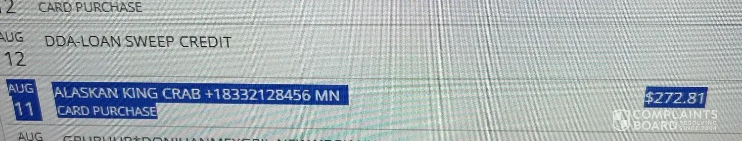 I purchased an order of your Alaskan King Crab on Aug 11, 2024 for $272.81 but never received it, nor was I notified of any delays in shipping or delivery! I would like either my order delivered or my money back please!