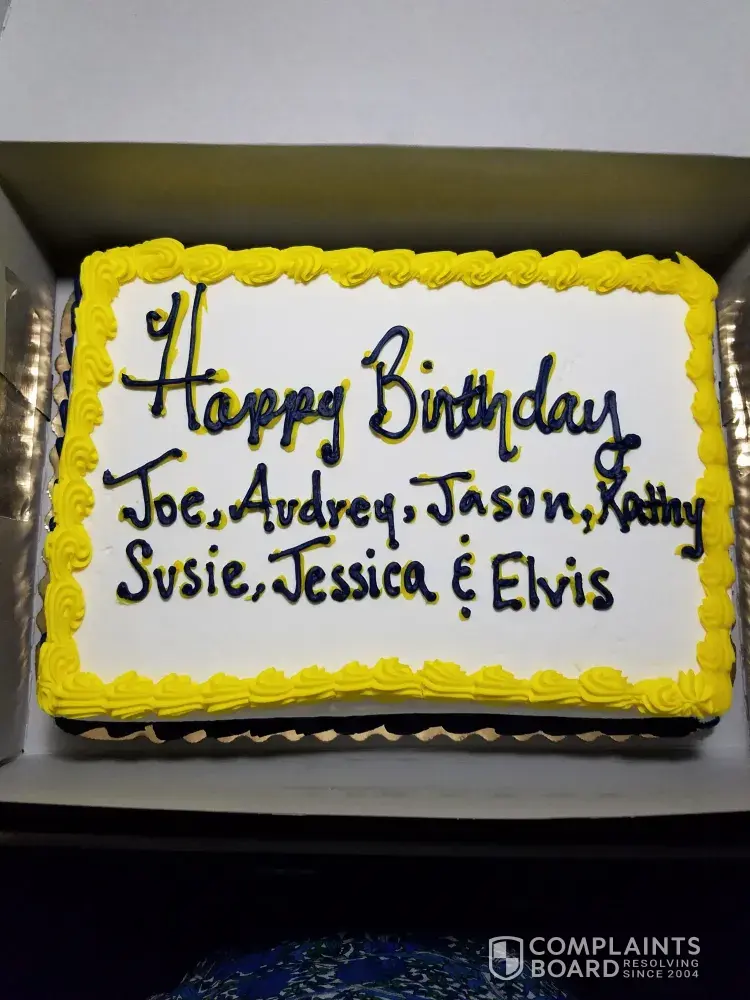 I ordered a birthday cake. I chose a cake like a sample they had made with Oreos on top. The cake was to say 'Happy Birthday, along with 7 names. I asked that the names be done in rainbow colors to brighten it up. She asked if I wanted the trim in colors and I said yellow and blue. I have attached a picture of the cake. I was totally dissatisfied with the...
