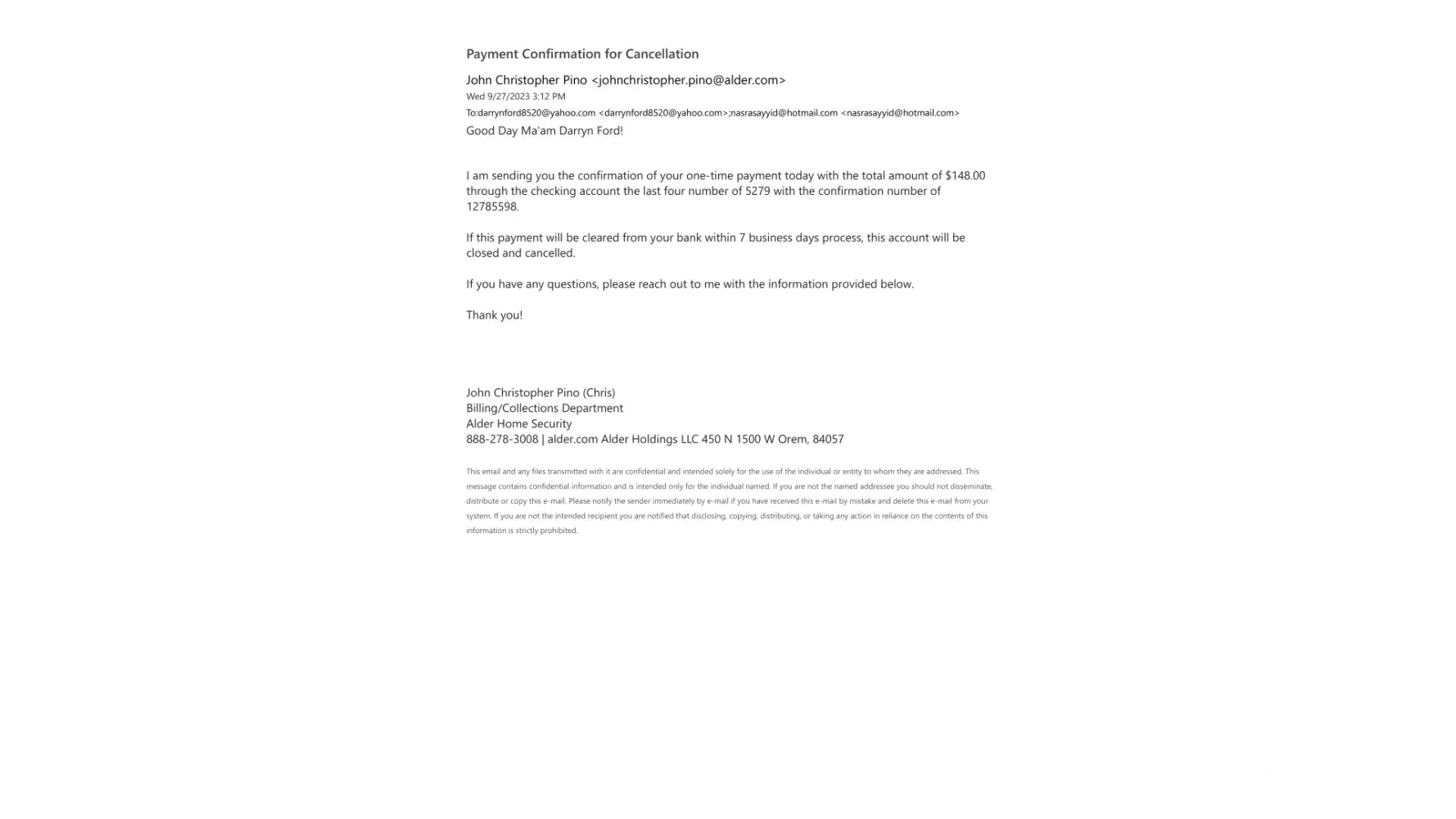 I called on 06sep23 to Cancel and Close the account with Alder Security's staff by the name of Bryan Amezquita sent me a notice of cancellation form, I filled it up dated and signed it. He wrote to me that and said account will not be closed till I paid 148. When I got the money I paid 148 another staff by the name of John Christopher pino sent me an email acknowledging they received the 148 and the account will be cancelled and closed after 7 days that was on 27sep23.