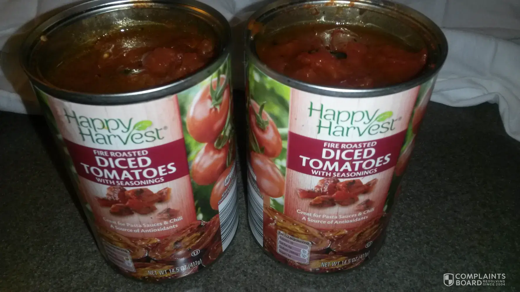 I bought 2 14.5 oz cans of diced tomatoes about 2 weeks ago. Yesterday I was making spaghetti. I opened up the first can to find burnt pieces floating on top and all through out the can. The 2nd can was the same way. I am so pissed, I had to go to the store and buy more to finish my dinner. I have use this and other Happy Harvest products for yeas a have...