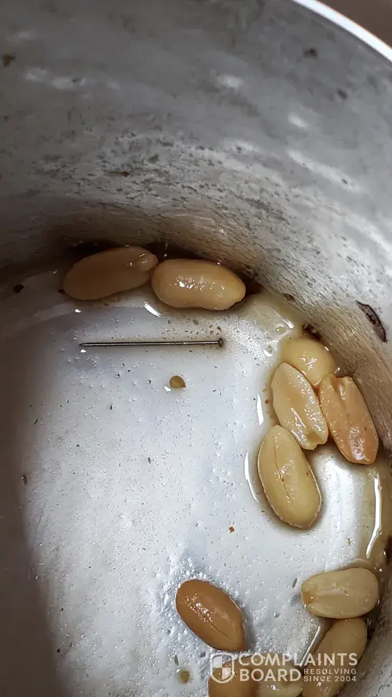 When I got close to the bottom of the can I noticed a lot more oil than usual. So I decided to take the peanuts out, dry them with a paper towel & put them into a new can. I found a small nail under the peanuts laying on the bottom of the can. My 3 year old grandson likes to tip the can up and drop the nuts into his mouth. Thank God he didn't swallow this nail! Someone is responsible for this. I have 4 photos of the outside & inside of the can.