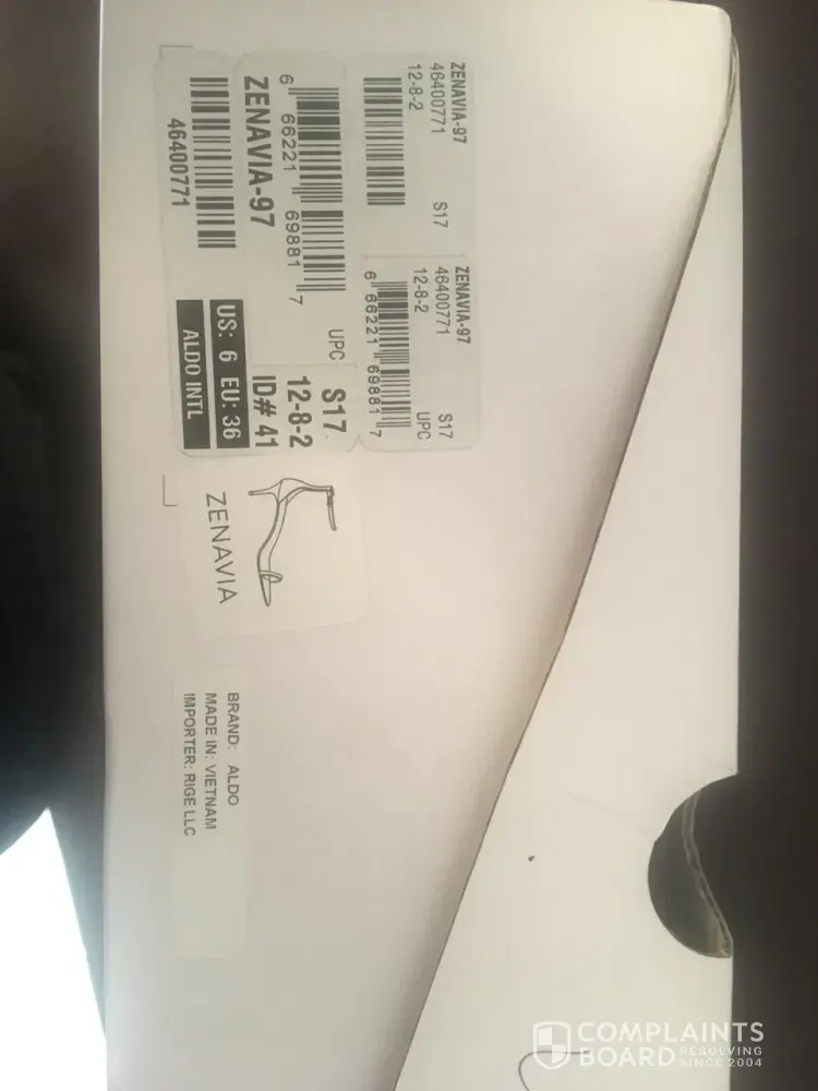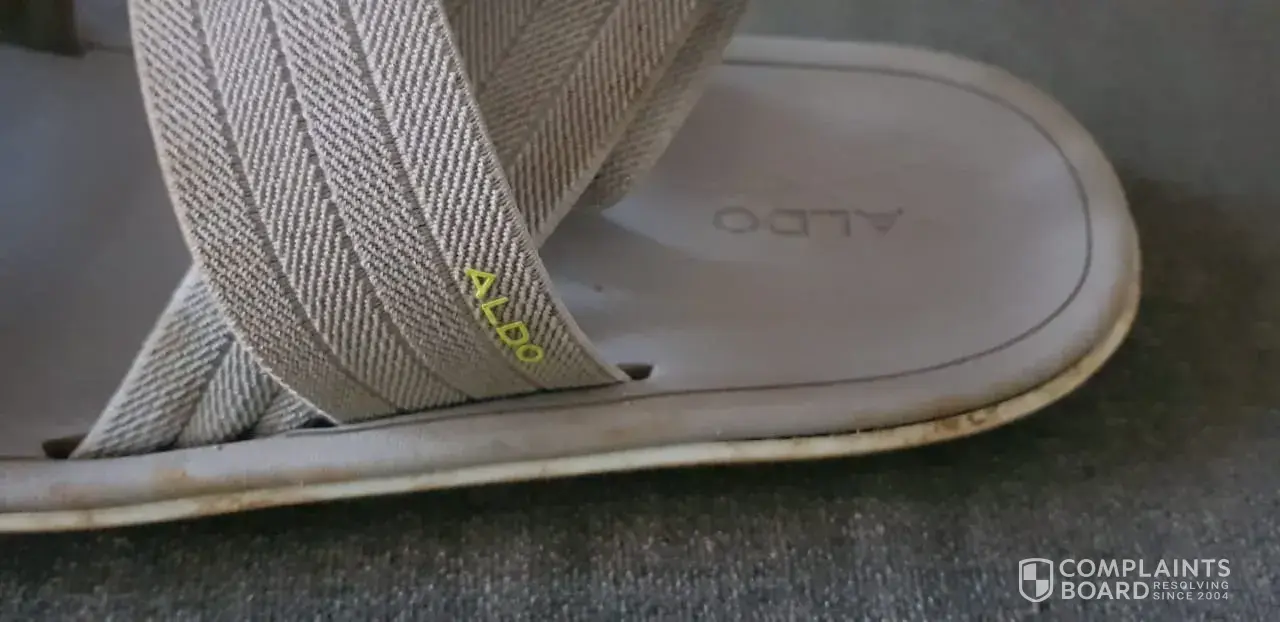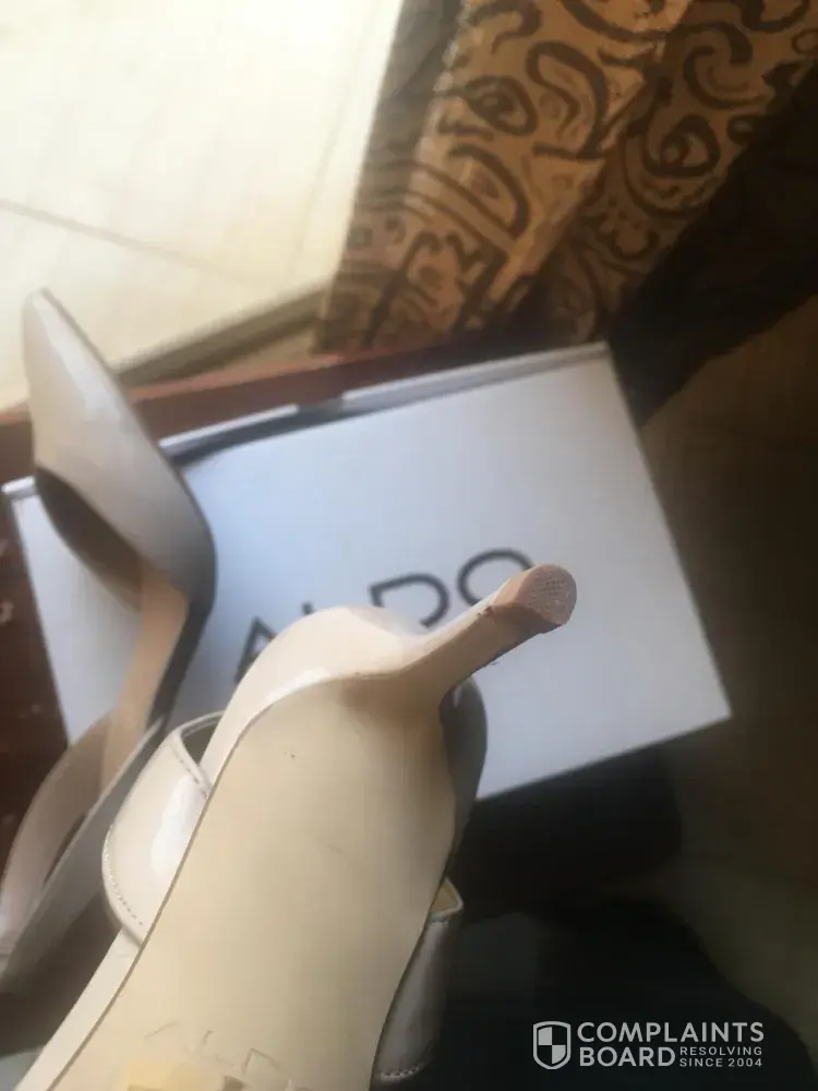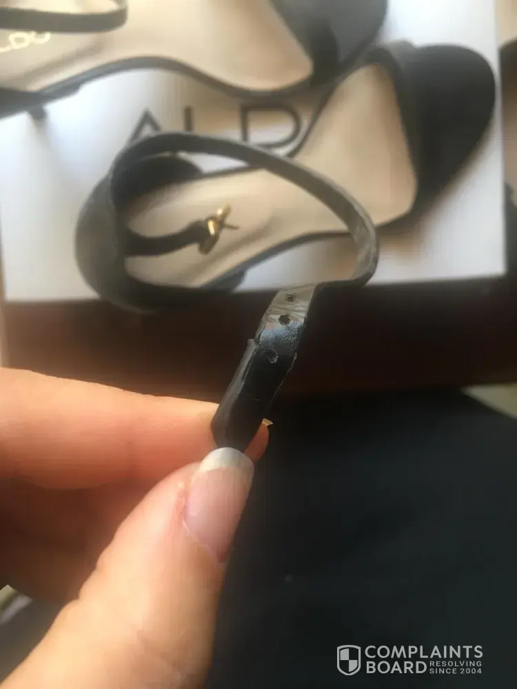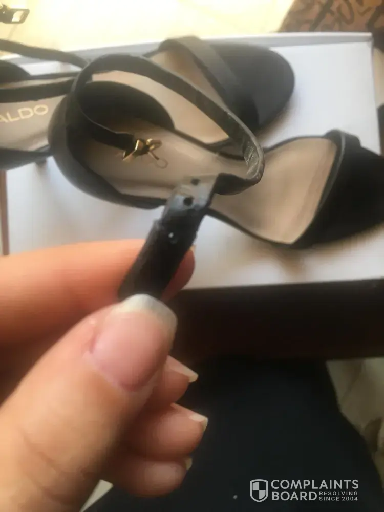 On April 2018, I bought beige shoes and attached pictures and after less than a month the small part below the shoe was broken and I sent it to the Aldo store to be repaired with Aldo original parts, after using it only once it wasn't comfortable and the bottom of the plastic was changed for the second time and The shoe became completely uncomfortable and Aldo refused to replace it with another, unfortunately another issue happened also in my black sandal after wearing twice I found a cut in the buckle as shown in the attached pictures.