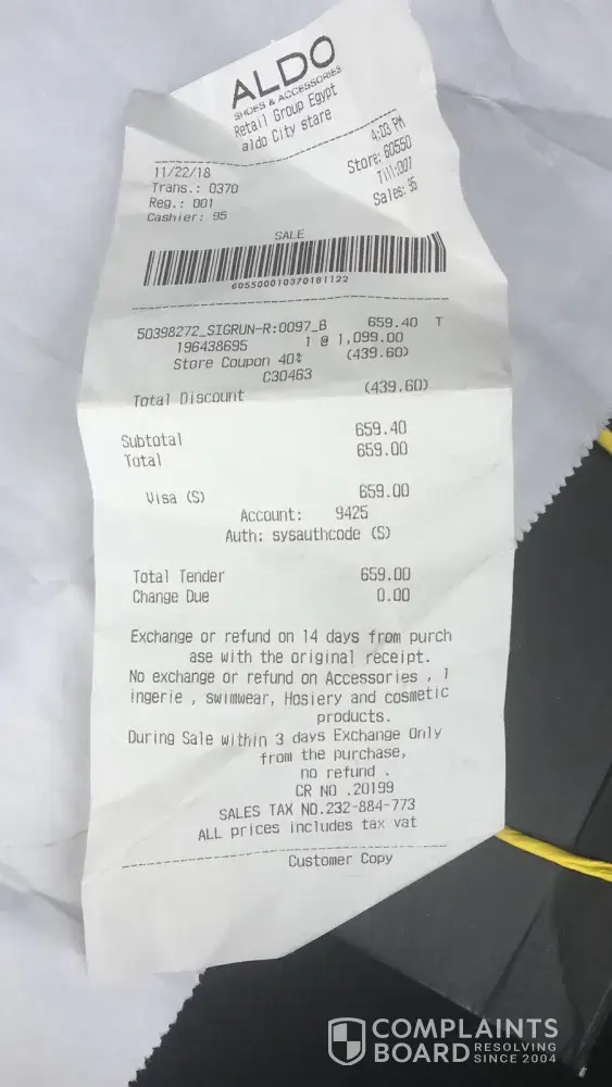 I have an official complaint regarding Aldo Egypt the quality of shoes is very bad moreover the customer service called retail group Egypt didn't solve my issue and at the end didn't respond into my email. This is your way to handle your clients that they have a complaint?