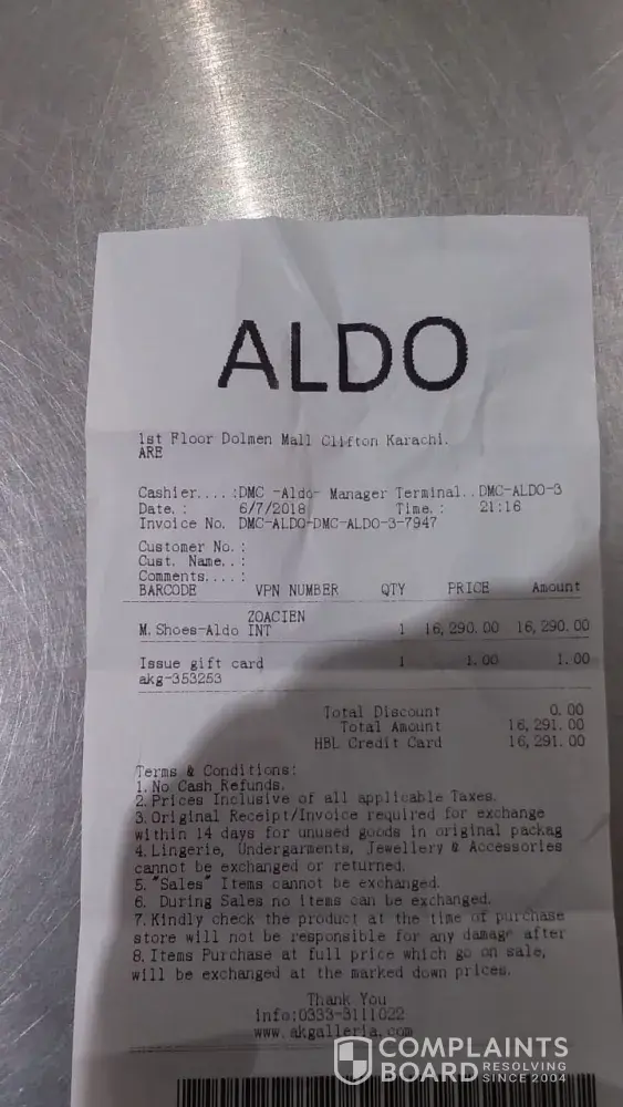 I did not take interest in buying the shoe for Rs: 16291( PKR) with a defect in colour so the floor manager convinced me and insisted to buy the shoe. I told him I would come back with my sibling or mother and then would decide whether I should buy it or not but the floor manager convinced me to purchase it and committed if your brother or sibling or any family member is not satisfied with the show. I will get this back. Same thing happened and I visited store for other shoe as I needed it for my brother's ring ceremony held in the next week but could not find anything at Aldo. I then requested them to refund me as committed becuase I was not buying the shoe at first. They said please keep your shoe and receipt with us and we will contact head office for the same and will deposit the money back to your account. I have been calling them multiple times again and again but there is no response. The manager named as ‘Narmen' blocked my contact number and now I am unable to reach them.