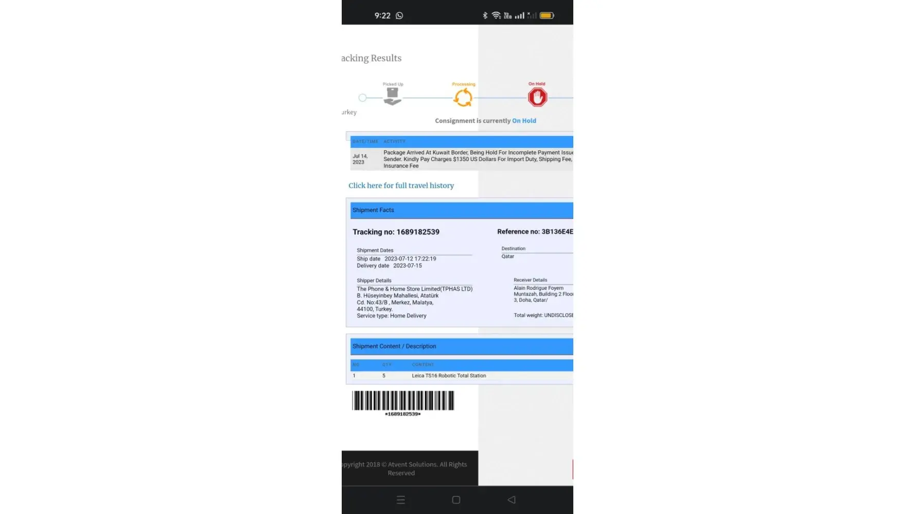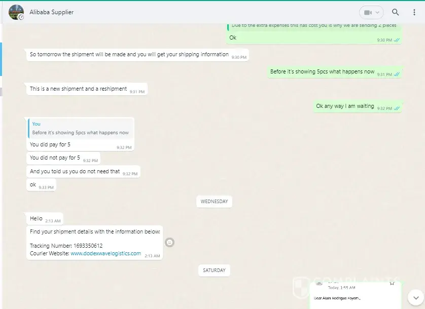 He would send me tracking info, which he did I followed the shipment around the world with every port named until it got to the USA. On March 11, 2023 Mr. Elgiseer told me on What's App the to shipment was held in customs for duty of $3500.00
