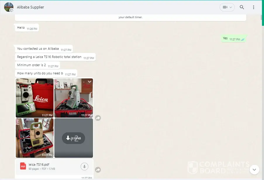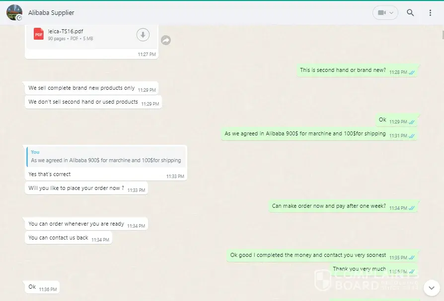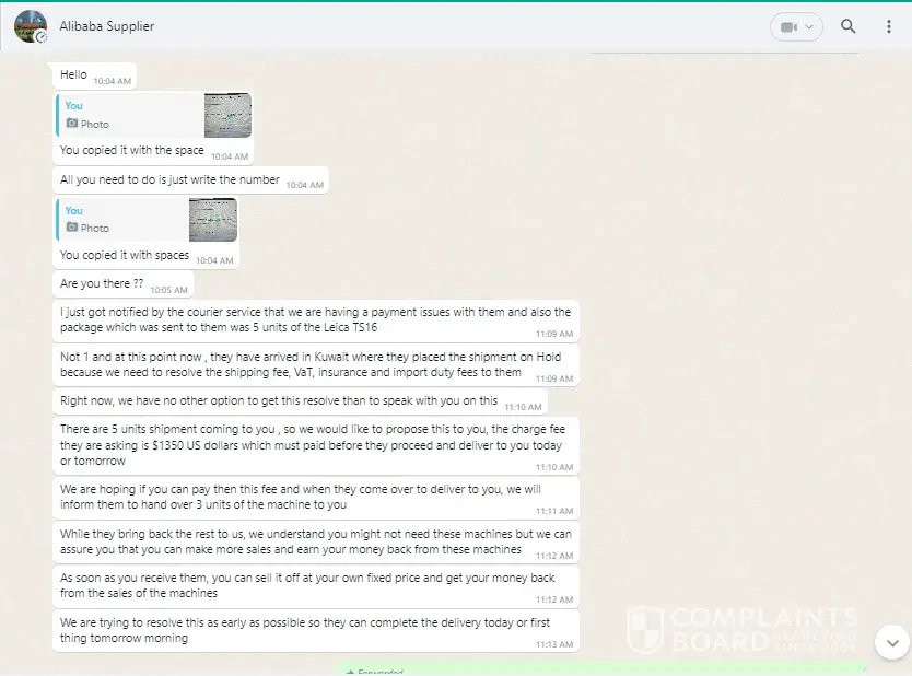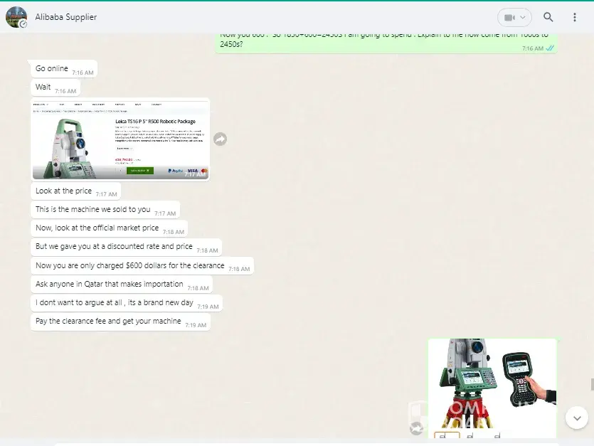 Actually I was in needed of machine total station leica TS16. I saw it in the platform called ALIBABA. I contacted the company online and we conclude for the price 1000$ including shipping. We agreed for advance payment and balance after delivery. After receiving advance payment, I received a email to pay again 1350$ with an additional 850$ without any reason. After many discussion, they promised me that I will received the machine in three days after the payment of 1350$.