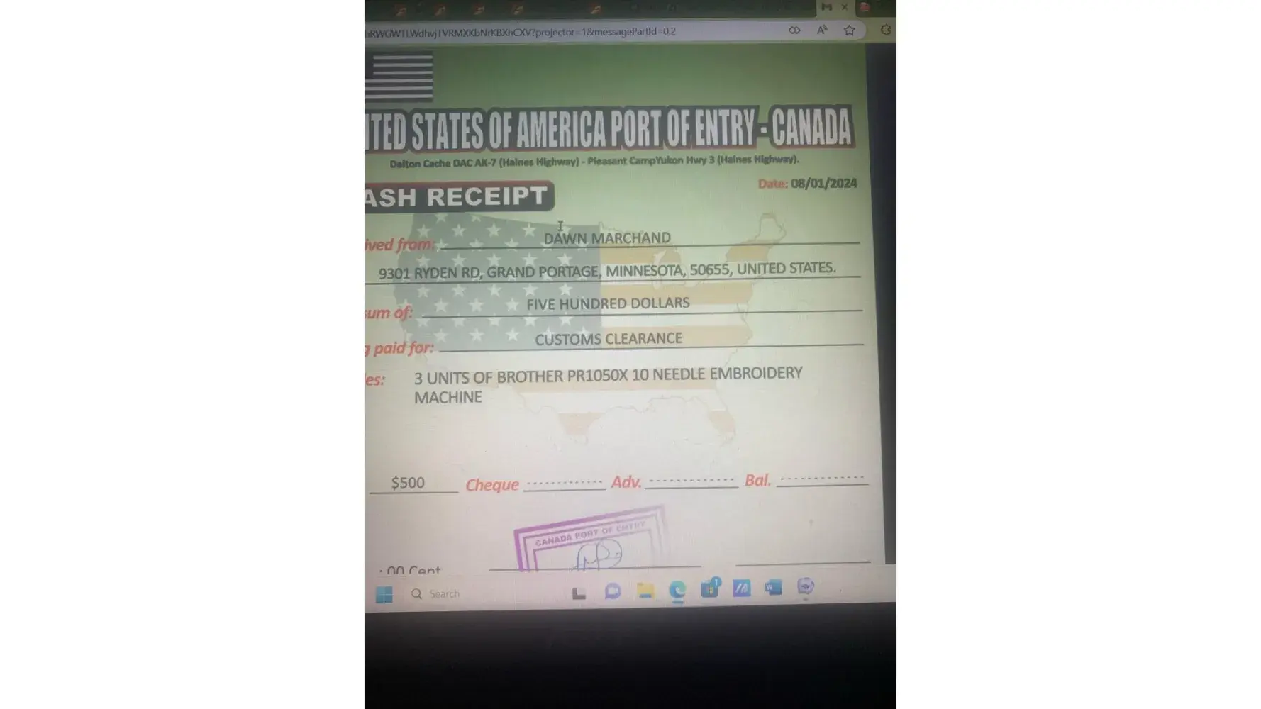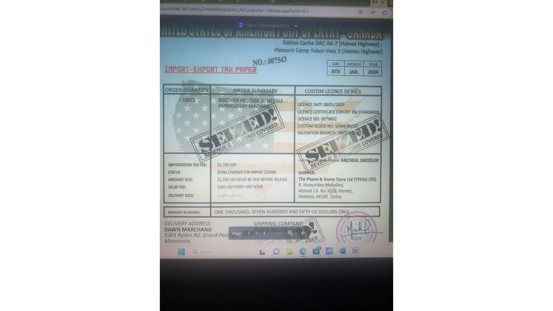 Claimed loss: 719.55 was uniformed Custom Clearance Fee682,70 cost of machine and shipping
