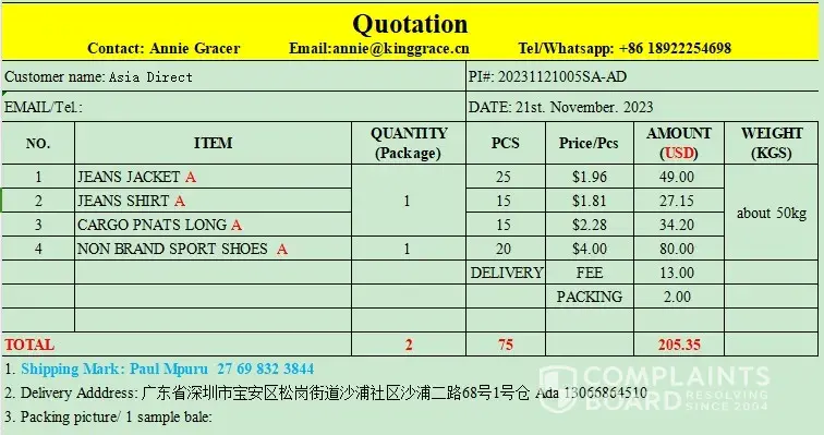 In March of 2023 I got a quote from a seller on Alibaba, GCF AUTO SERVICE LLC for and ATV. I was quoted a total of $750.00 US for the ATV and delivery