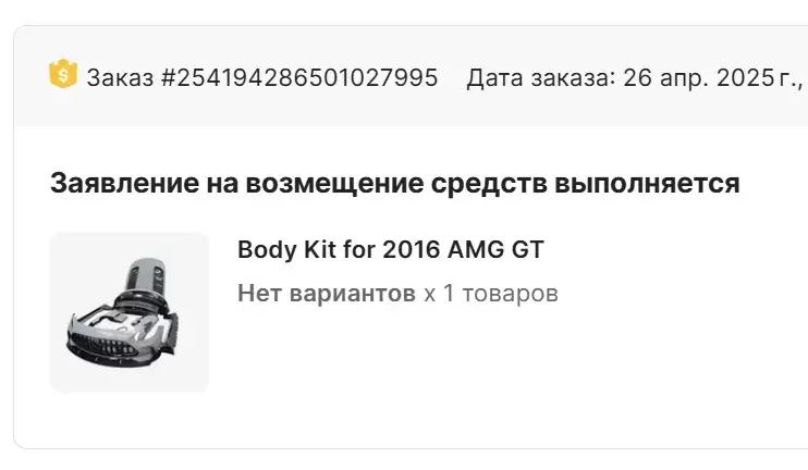 I have ordered a body kit to AMG GT through Alibaba website from the company named Guangzhou Chui Chui Feng Automotive Products Co., Ltd (seller name Mr. Cheng Chen). Order number #254194286501027995. It was promised that delivery will come in 10-12 days, however it took 20-25 days to come. They said that the order will be delivered to home, however, I had...