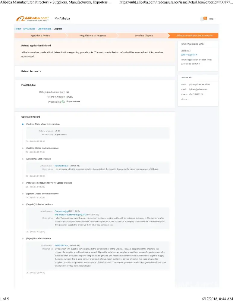 I opened another Alibaba Trade dispute in June 2017. This went back and forth, supplier would lie and I would be asked to continue the order. Each time Alibaba dispute would require me to respond and upload proof even when I told them I was traveling and to please give me longer than 24 hours to respond. Including on my 10 year wedding anniversary trip.