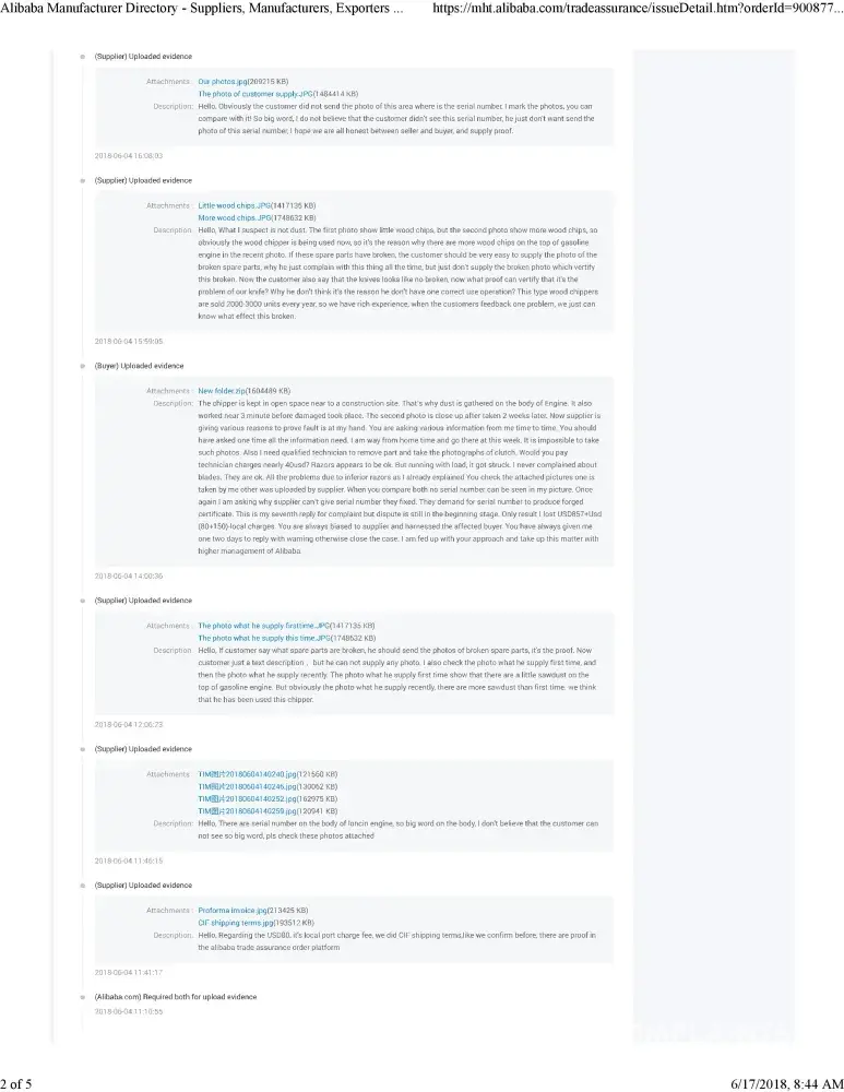 This product was defective due to manufacturing defect and Engine fixed to the wood chipper appears to be defective. I made a complaint Alibaba Trade Dispute Mediation Department on 17/05/2018.The complaint was investigated under the Trade Assurance Order No.[protected].