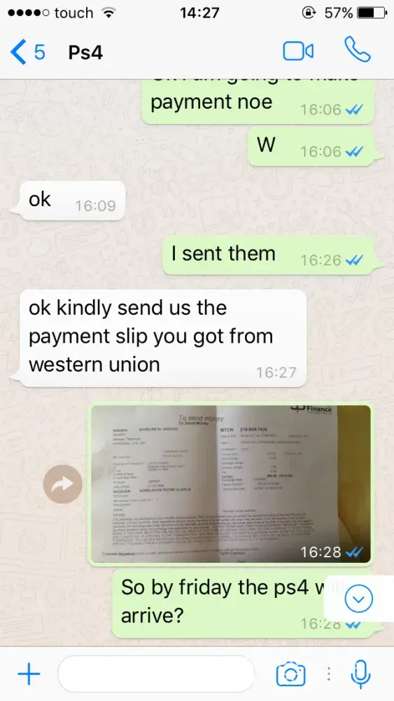 I was searching on alibaba for ps4 pro and then i found an add that took my attention and the supplier had 3years gold member so i took his number from the add (+[protected]) and contact him i asked him about the safety he told me (we are verified Gold member on alibaba and before alibaba could make us verified, they came to our warehouse and see we are legit supplier...so we are assuring you 100% guarantee that your package we get deliver to your doorstep, we are giving you 100% money back guarantee, you love it or your money back. we are do confident, we give every client a 100% risk-free, money-back guarantee. first-class, personal services, precisely targeted, time-tested..) so i asked about the payment methode he told me western union he gave me the western union info and i sent him the money (250$) and i should have gotten the ps4 in 4 days i contact him after 4 about the ps4 he told me that it has been delivered to your country and need another 250$ for the assurance i told him i dont have the money and that i wanted my money back and then he blocked me and lost my 250$ how can you help me please i worked for a monthe to get that money i sent the western union so you could see the payment and then the add that was in my history and now it's unavailable and the conversation pic of the western union info