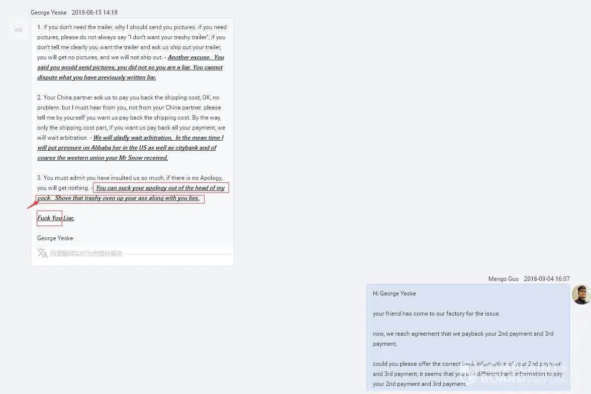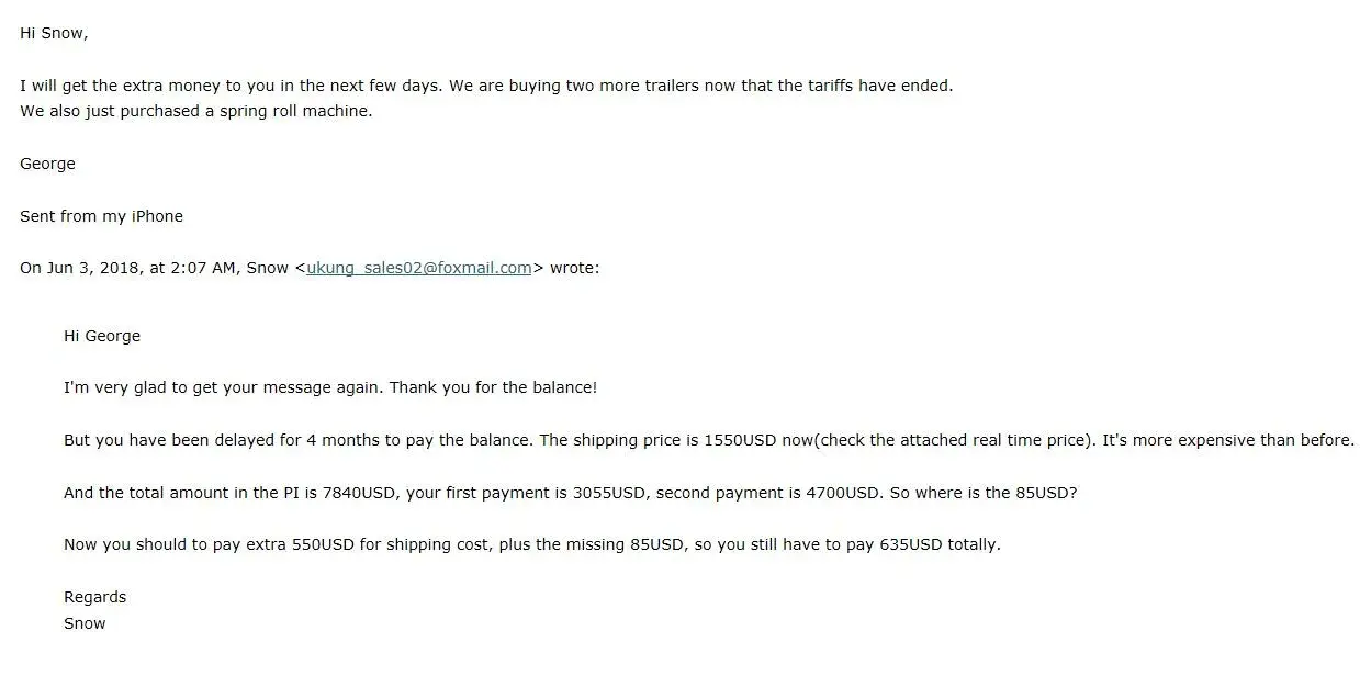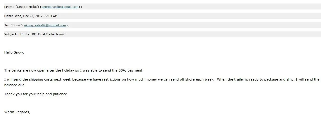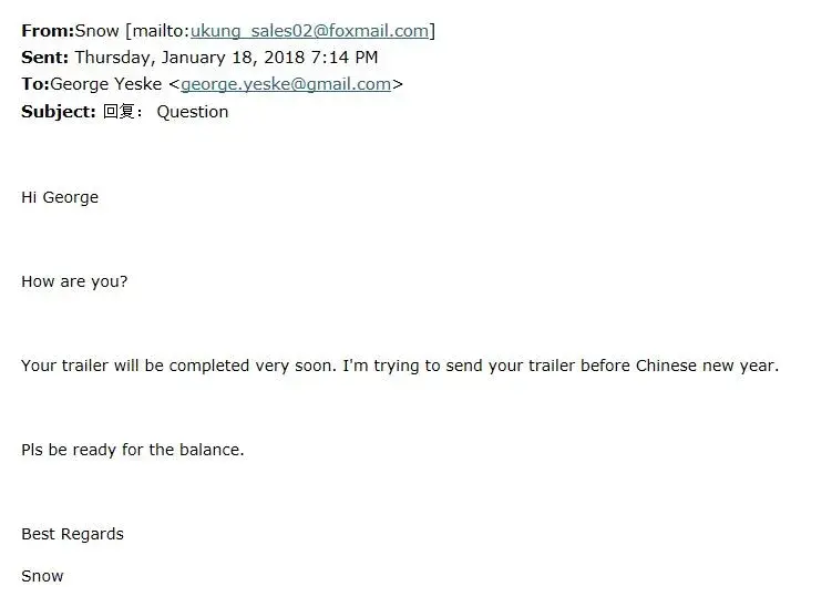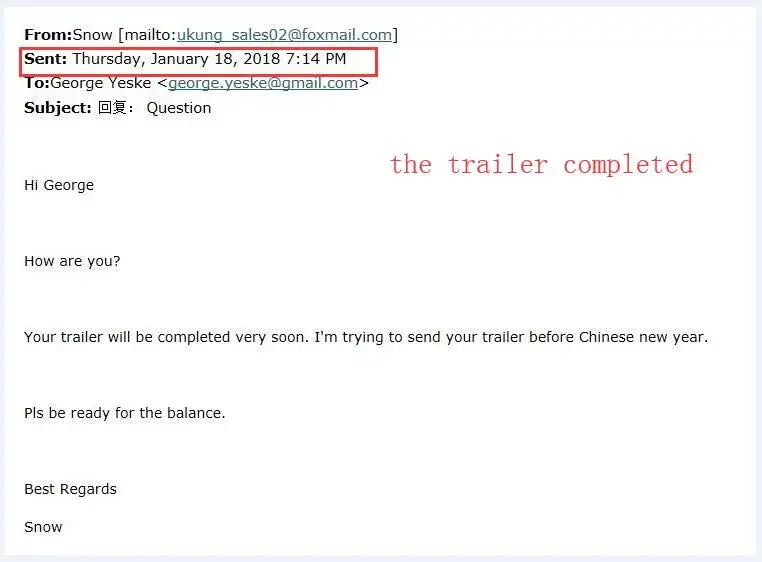 5. George gets delay for over 6 months and I didn't complain to him. but we were busy moving the factory, so I told him we will ship the trailer in 20days. But he can't accept that and ask to cancel the order.