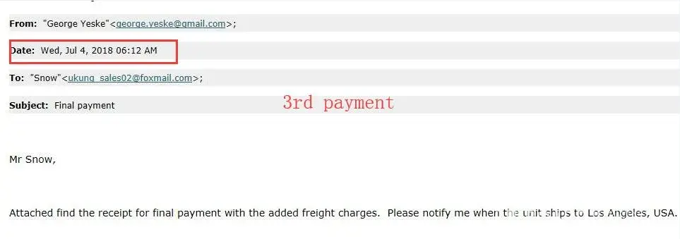 4. Mr.George get long time delay, and the shipping price had changed, then he paid for the extra shipping cost on 4th Jul 2018, see the attached picture "time of 3rd payment"
