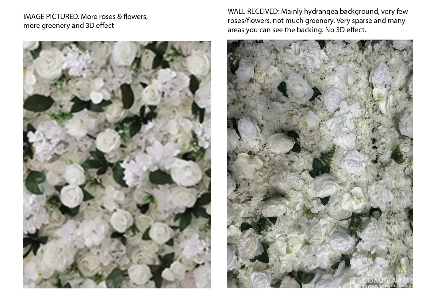I purchased a flower wall from a seller on Aliexpress on 28 October 2023. The wall I received was nothing like the image shown and I have been disputing it through the seller and Aliexpress ever since. It's now 6 March 2024 and this is still continuing with no resolution. Continual attempted conversations with the seller asking for a resolution, they simply respond 'the order is being checked'