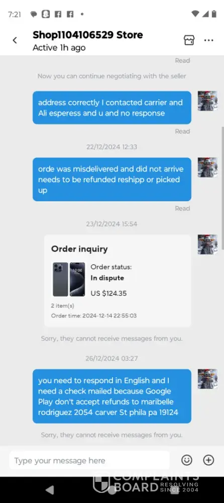 I purchased a birthday present on Aliexpress approximately on the 19th of February 2024. When my friend received her gift and described it to me, it was not what I ordered and the product description was misleading. In mid March, I contacted customer support and the seller at Aliexpress and have been met with continuous resistance, even though the seller offers refunds. Aliexpress customer service is extremely poor and they offer no support, only challenges that I can't meet eg my friend does not have the original packaging that the item arrived in so I can upload a screen shot of the packaging. I have uploaded a screen shot of the item purchased but this information is insufficient according to Aliexpress customer service. This dispute is ongoing with no contact effort made by Aliexpress and I may have to resort to PayPal to end this dispute with a full refund.