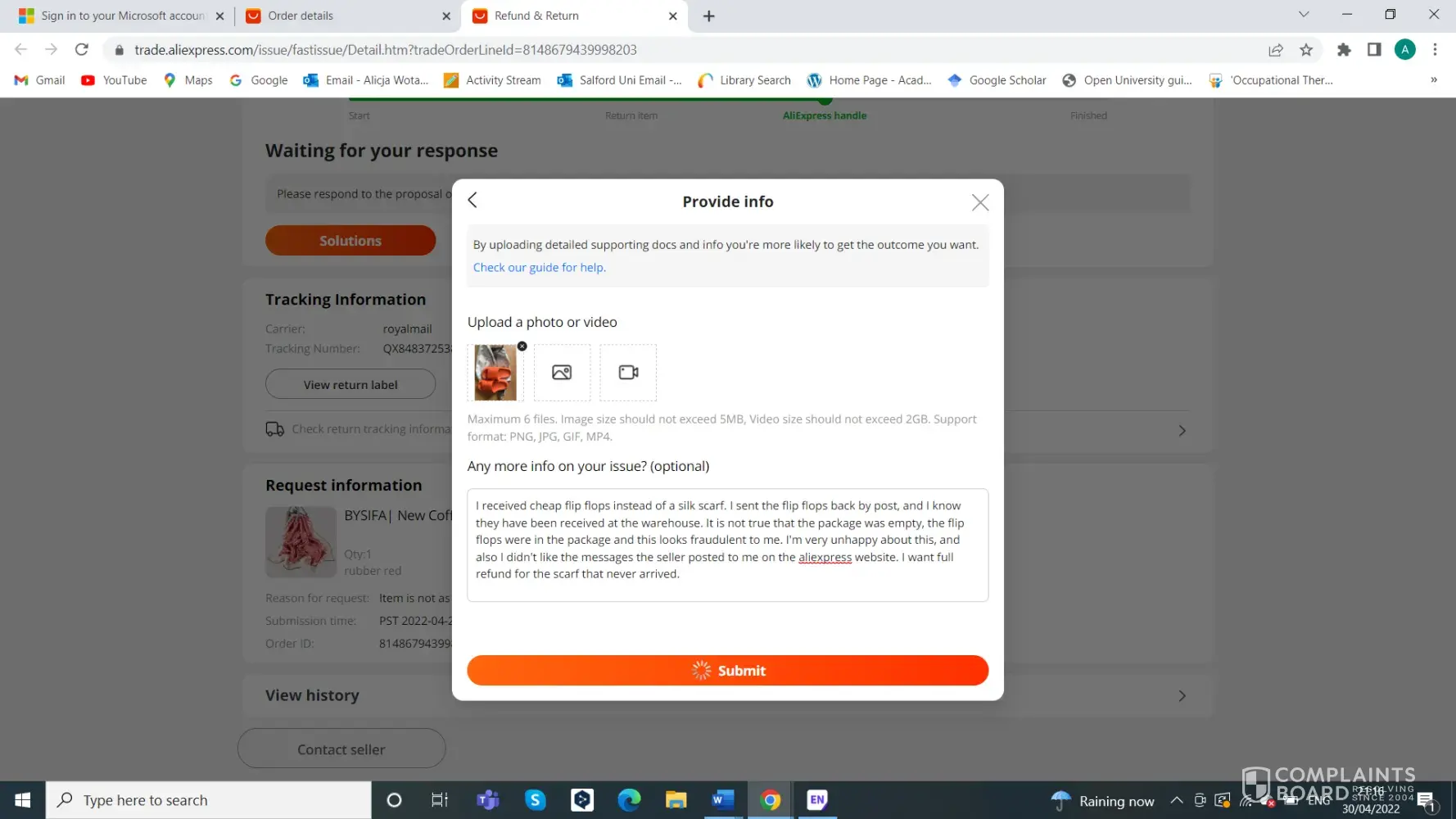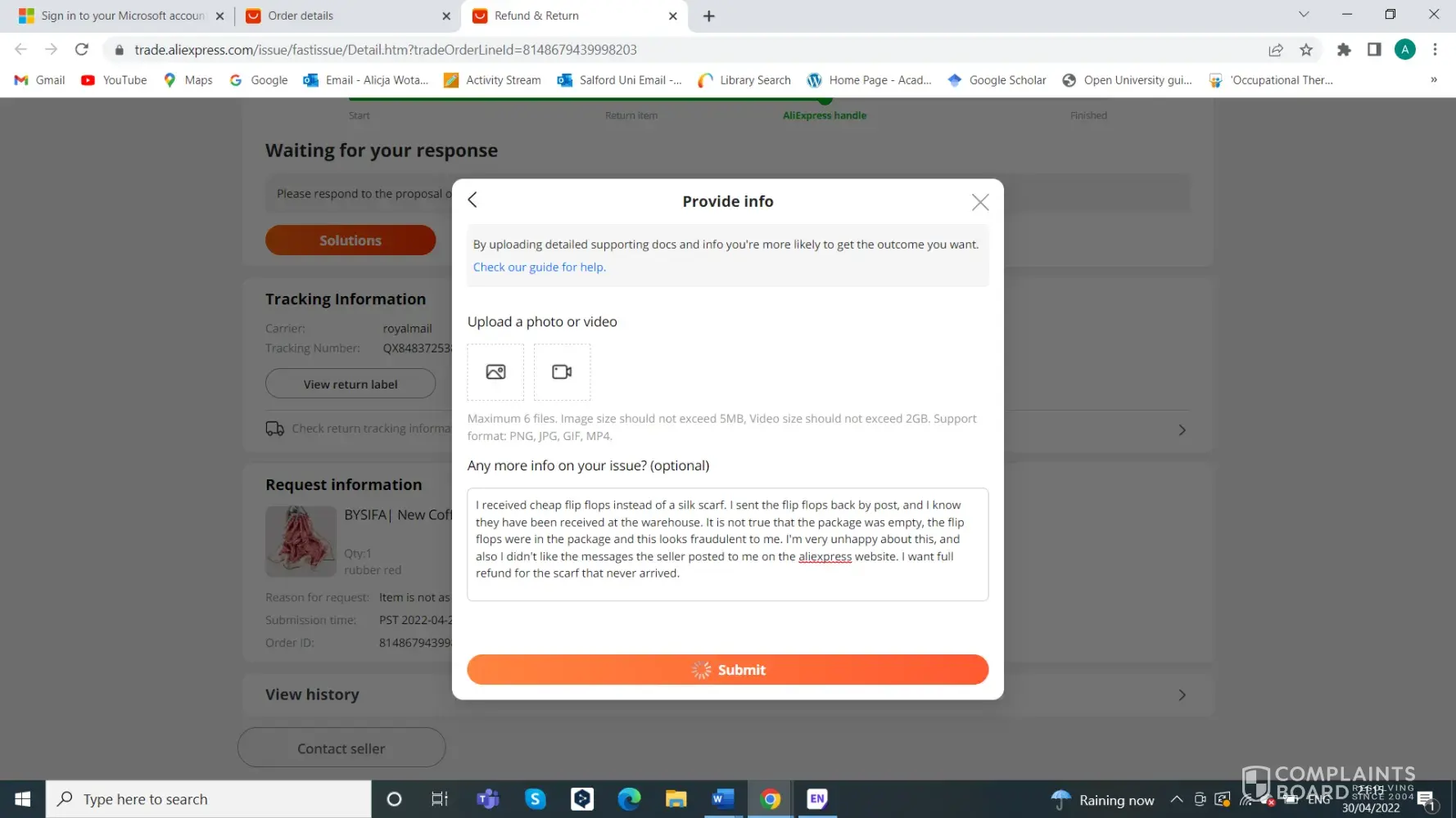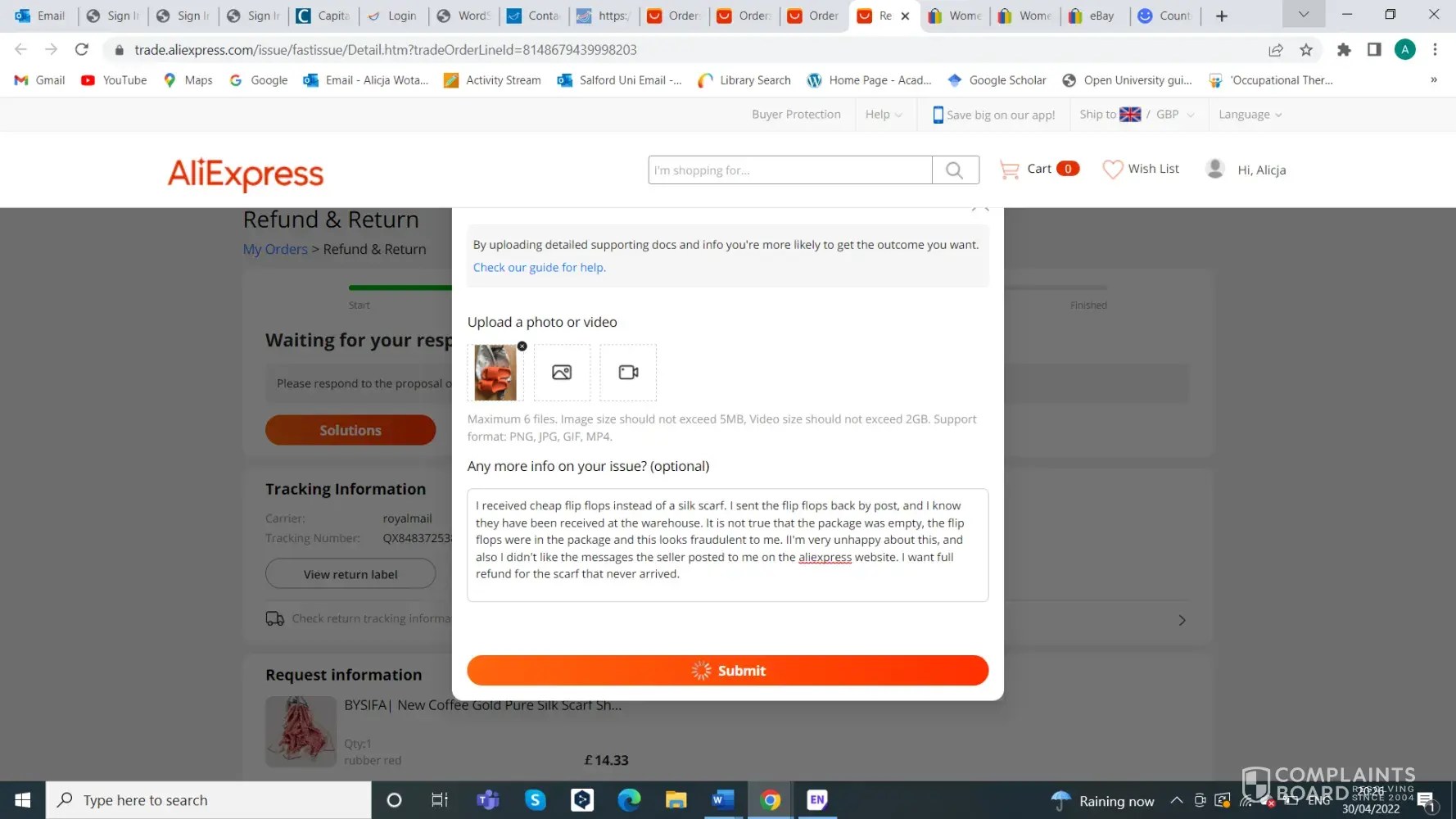 I received cheap flip flops (as in the photo) instead of a scarf for 15.59 GBP (incl. shipping cost). I returned them using a label provided by aliexpress, and they arrived at their warehouse on the 28th of April. In the meantime, I started receiving messages from the seller that I didn't like, where they tried to blame me for not providing the barcode even though I sent all the information within the parcel. Later I received a message from aliexpress telling me that the package I sent was empty.