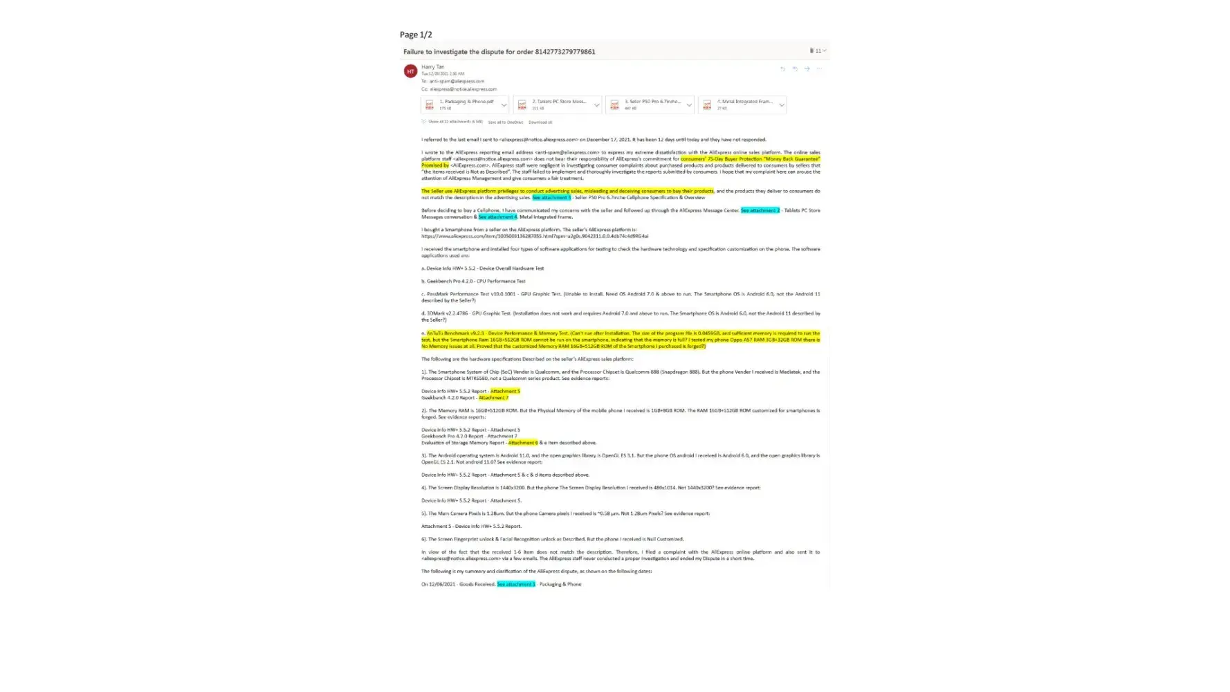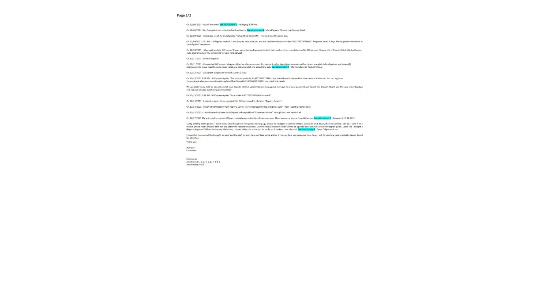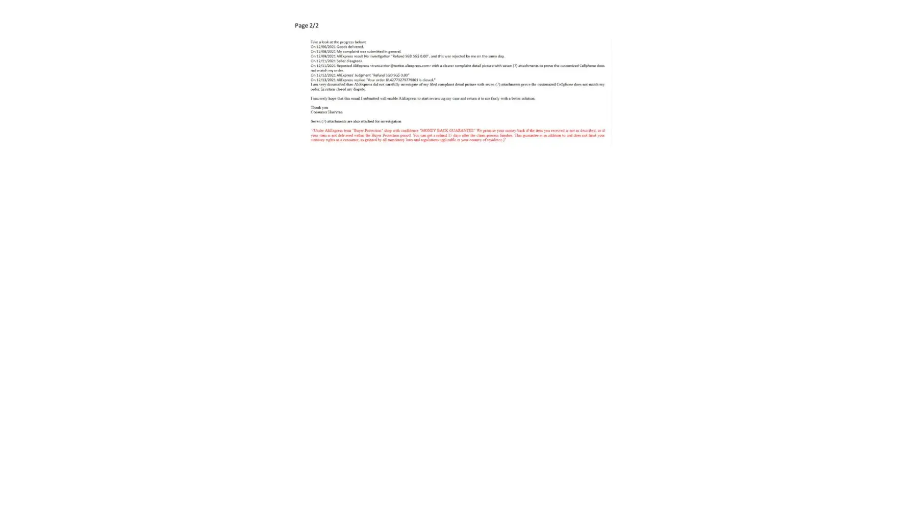 Complaint Letter on 28/12/2021 - See Attachment C. [protected] Last Email to Anti-spam@aliexpress.com