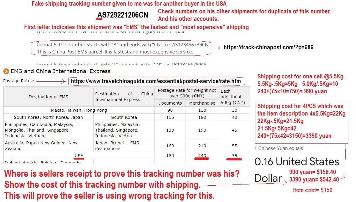 I agreed to buy a battery from a seller at $150. Paypay gave Ali $159 which has taxes for the state of PA. The seller instead of shipping this 22Kg(48.5 pounds) battery, he gets some junk like a pack of seeds or something and sends it to anyone in the USA. He gave me this same tracking number as if it were for the battery. When it finally reached "delivered" and I didn't get it, I complained to the seller, and he tells me to go to the post office and get it. I couldn't reason with this seller, so Ali's resolution team steps in. I showed them evidence that this seller would have had to pay $558+ to ship this battery and that is almost 4 times as much as I paid for the battery. I tried to get this resolution team to demand proof of purchase of the shipping for this battery and they just flat out ignore me and are demanding that I go to the post office and get documents that prove that they never had this battery. This is got to be the stupidest thing I've ever seen. The Post Office does not cater to scams. Now after trying to arbitrate this for many days, the tracking is showing delivered three times, all three days apart. This is because the junk he sent someone, is being given back to the postman for re-delivery. This resolution team refuses to consider that also. They also don't look at his feedback and see that his last 30 sales, he didn't ship anything and stole the money with the help of this resolution team. I added up, he has stolen $6048 on just one of his many accounts by using his tracking scam. There is corruption with this company, they are just criminals. This all appears to gone ballistic around the beginning of September 2021. I see this tracking scam on many other sellers feedback for high priced items mainly. I believe this company doesn't like their $2.8 Billion fine from Beijing and are retaliating against their customers. This company needs to be shut down, fined $ Billions more for the money they stole from good people. Employees in this resolution team, need to be doing prison time, because I believe they are part of the scamming using fake tracking. Americans are well aware of the "mystery seeds" and other junk coming from China having meaning, now we know the real reason behind it, "getting a tracking list that shows delivered" to be used on a product they don't even have to sell. The simple solution is "make the seller show proof he paid $558+ for this shipping and tracking", and they won't do it, because they know I'm right. Now look at all the others that lost money to this scam on just one of his accounts-- https://www.aliexpress.com/store/feedback-score/912168094.html?spm=a2g0o.detail.1000061.5.5a4f3c08kFBmrv