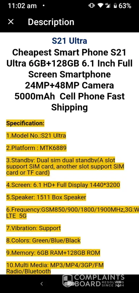 The phone is not as described by seller. The specifications of the phone are different and very inferior. The memory is much less at only 1.3gb. I have sent evidence but this has been ignored. AliExpress asked for evidence of what is shown on the phone, however what is shown on the phone is false according to test apps and Google apps. Without sending the phone back I can't prove my case. I would have to pay the shipping cost which is probably more than the phone is worth.