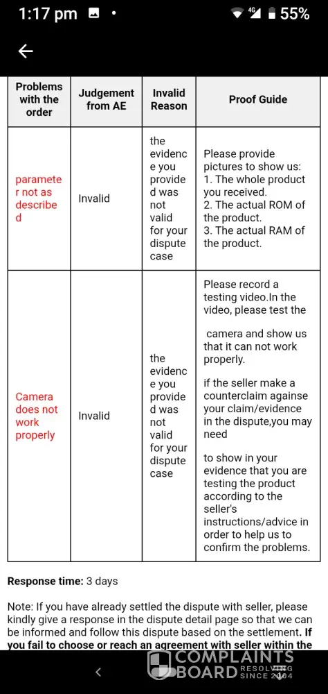 I provided correspondence and photographs to evidence my complaint, Aliexpress judged against my complaint, upon appeal and further evidence Aliexpress again rejected my complaint.