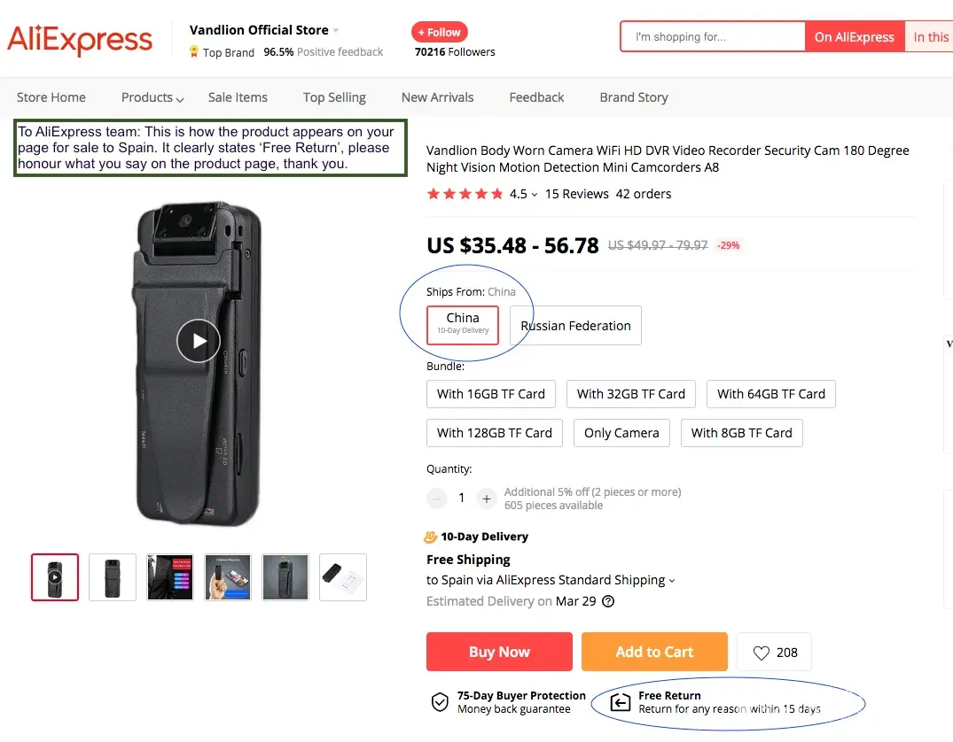 On the other hand on the product presentation page of AliExpress website the goods is offered including 'Free Return' (screenshot again below).
